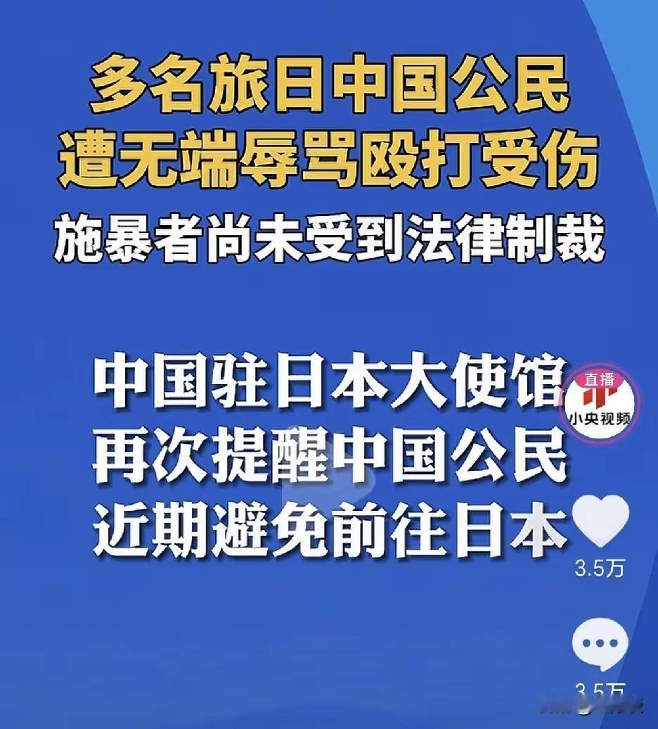 最近不少在日本旅游的中国游客,遭到日方不明人士无端的辱骂、殴打,但是犯罪嫌疑人却没有受到相应的处理,真的让人非常的气愤,但是也很无奈,毕竟这是在日本,所以最近这段时间就老老实实在国内待着吧,千万不要羡慕日本的美景,不顾劝阻前往日本旅游、研学等。否则在日本挨了骂挨了打还没人管。毕竟目前中日关系进入到最低点,所有的责任完全在于日本。日本整个国民对我们都不是很友好,日本军国主义泛滥,所以这个时候千万不要给国家添乱,只要在国家内老老实实待着,就是对国家政策的最大支持。