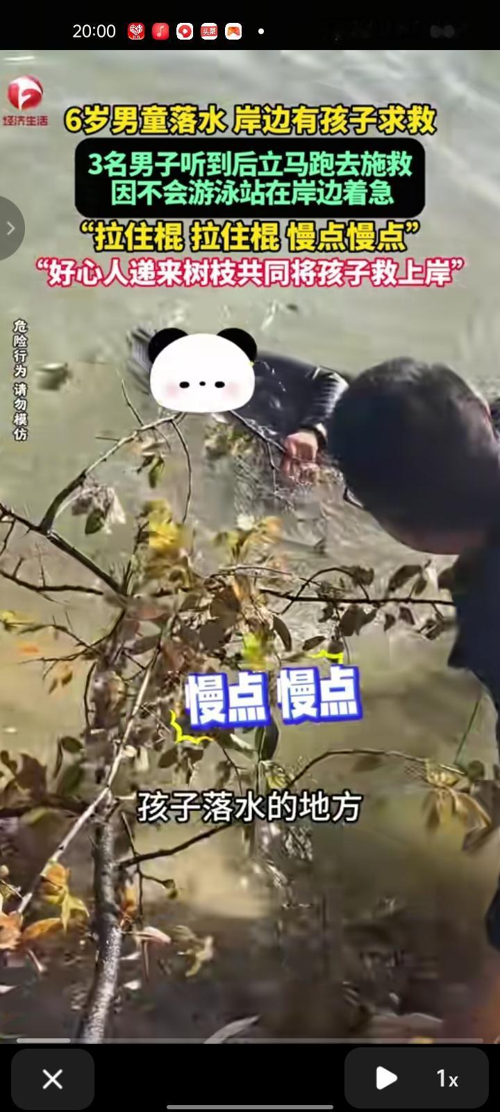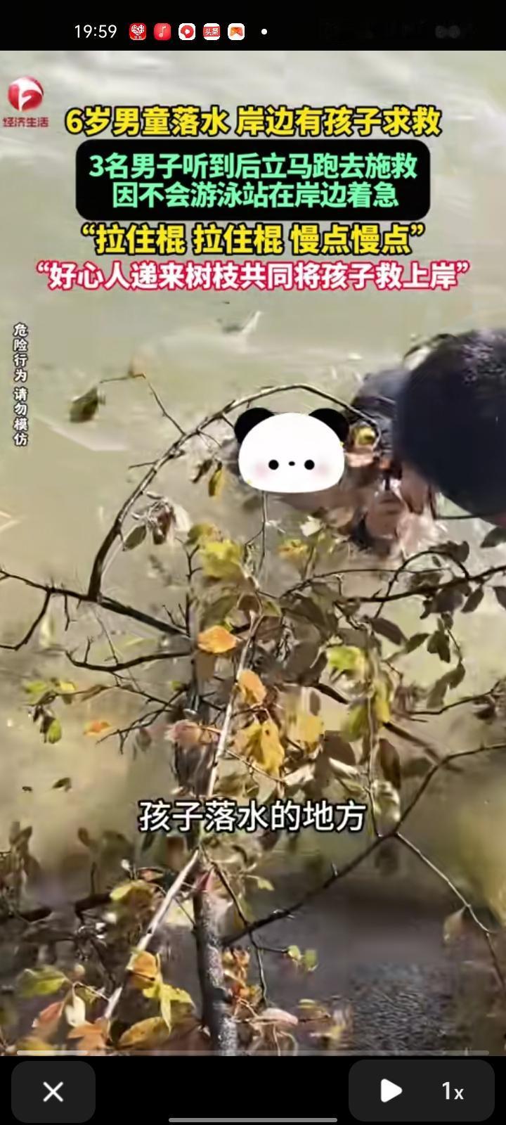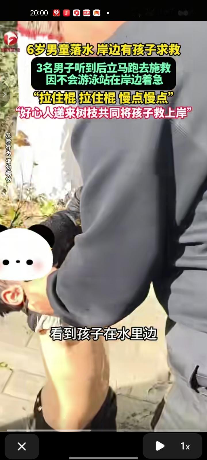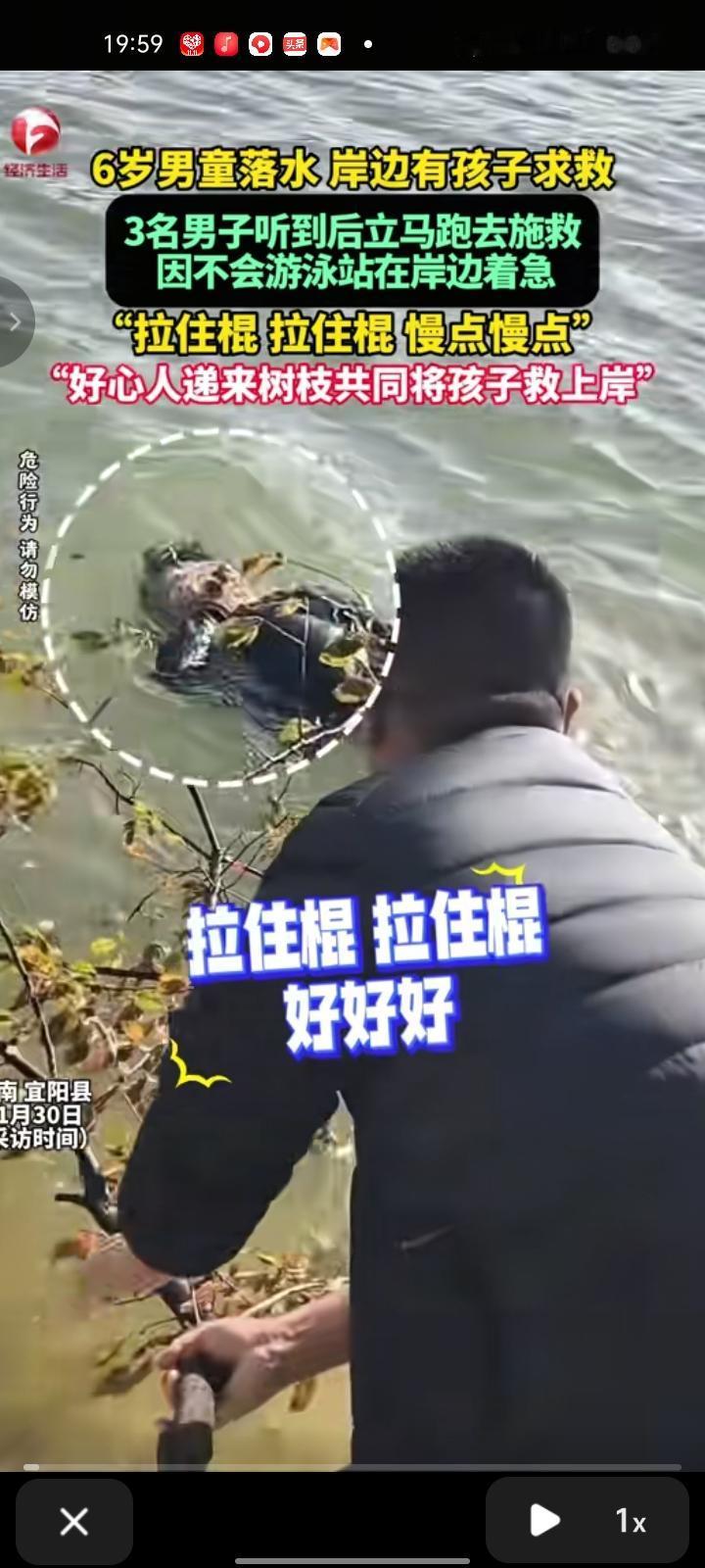 11月29日,洛阳市宜阳县。六岁左右的小孩在河边玩耍不慎掉入河里,三男子听到后立马下去施救,因为不会游泳站在岸边着急。危急时刻,有位好心人递来树枝,和他们共同把孩子救上岸,上岸后孩子吐了很多水,孩子无大碍。