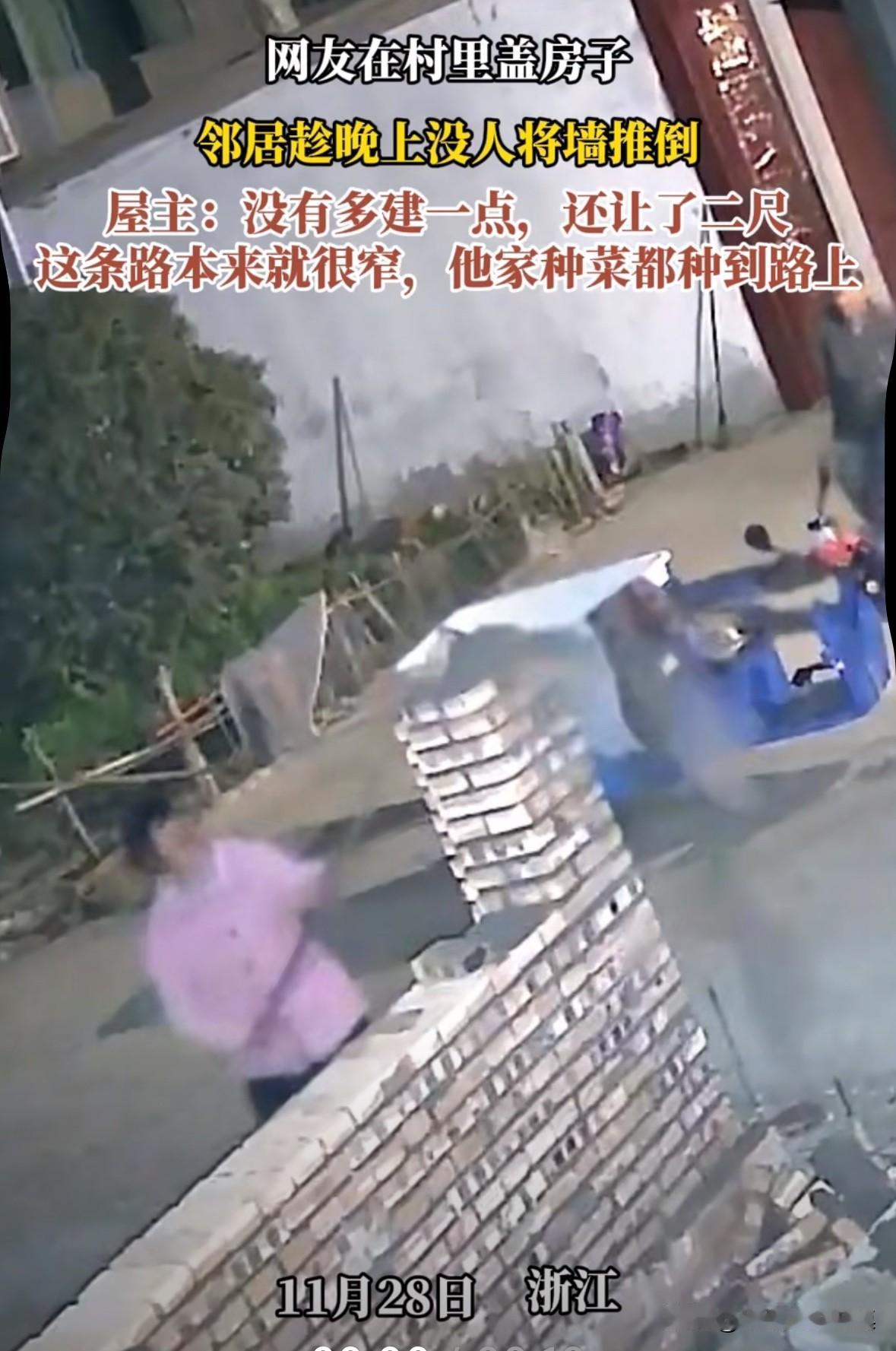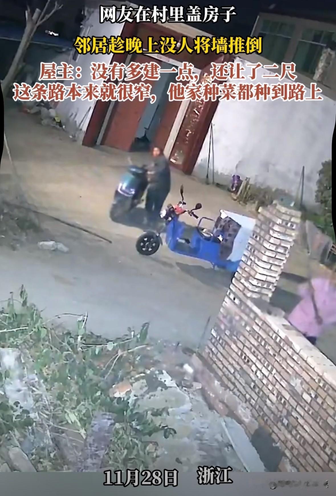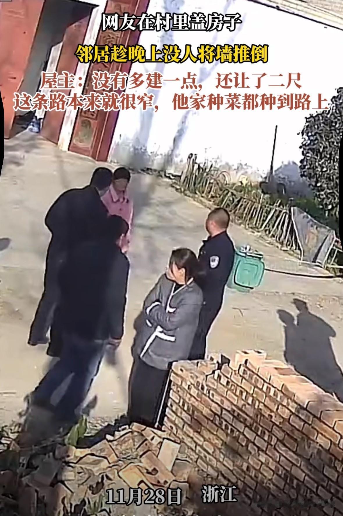 男子在家里盖房子,没想到邻居趁着晚上没人,把男子新盖的墙推倒了。 双方争执不下,于是选择报警。 男子说:“我们没有多盖一点,也没有占他家的地,还让了二尺,他家种菜都种到路上了!” 警察协调期间,邻居还是不依不饶,就是不让男子这样盖,还让退后几尺才罢休! 只能走法律途径了。 邻居得寸进尺,这下好了,一尺也不让了。 这种人就不能惯着! 农村为什么这样的事这么多,每一家的宅基地有多少平方不是清清楚楚吗,直接量一下就好了,都是邻居,何必这样吵闹邻居新建的房子