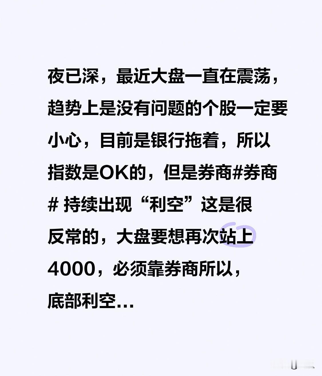 夜已深,最近大盘一直在震荡,趋势上是没有问题的 个股一定要小心,目前是银行拖着,所以指数是OK的,但是券商券商 持续出现“利空” 这是很反常的,大盘要想再次站上4000,必须靠券商 所以,底部利空就是利好,希望大家能明白 12月份是收获的季节,大盘必定站上4000,关注券商