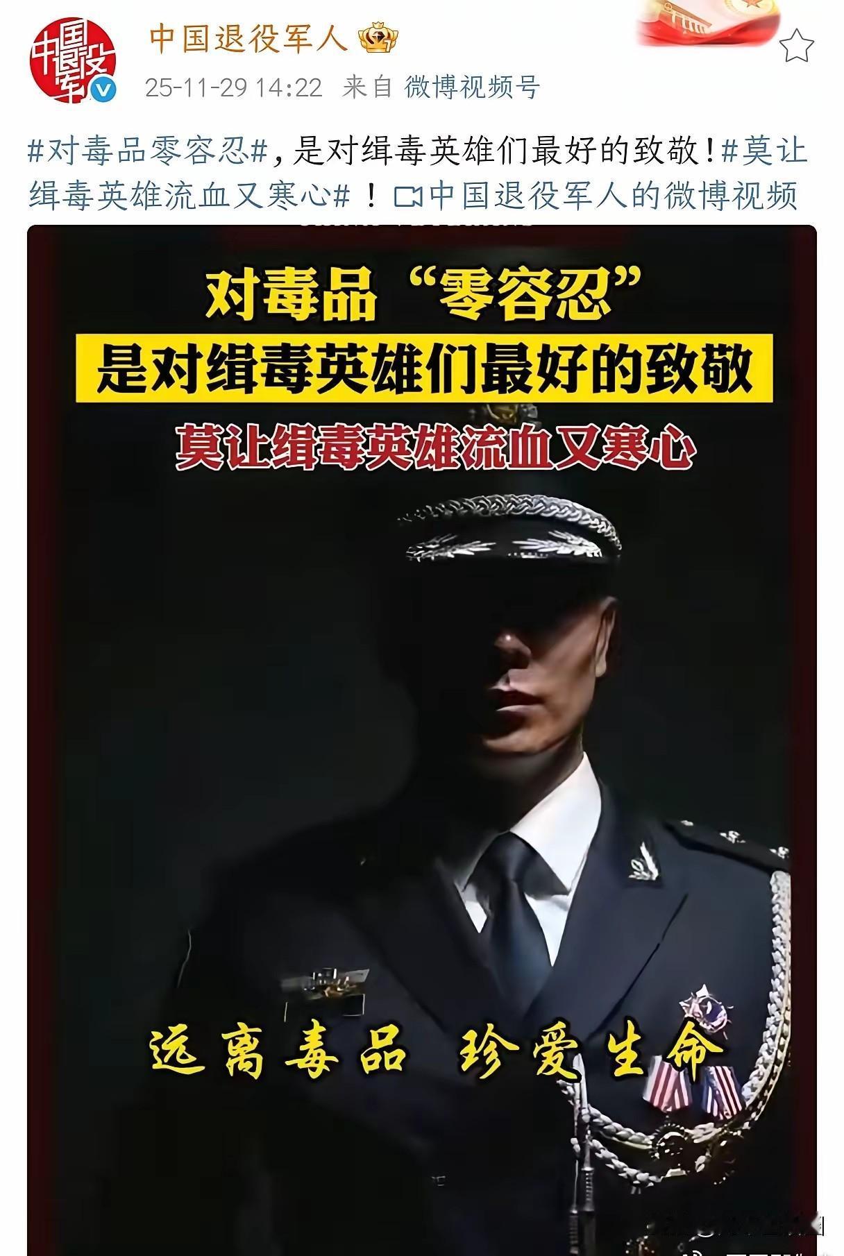 热血沸腾!中国退役军人网官方账号硬核发声支持毒品“零容忍”,这声呐喊,戳中了无数退役军人和国人的心底!对毒品零容忍,从来不是一句空话,是对缉毒英雄用生命换来的安宁,最沉重也最滚烫的致敬! 谁忘了那些在刀尖上跳舞的缉毒英雄?他们隐姓埋名,穿梭在最黑暗的角落,有的倒在毒贩的枪口下,连墓碑都不能刻上真名;有的被报复连累家人,一辈子活在隐秘的恐惧里。他们用血肉之躯筑牢防毒长城,就是为了不让毒品再撕裂一个个家庭,不让百年国耻的悲剧重演。 退役军人更懂守护的重量。穿上军装时,他们守国门、护疆土;脱下军装后,他们依然是禁毒前线的坚定支持者。对毒品的零容忍,早已刻进他们的骨子里——见过太多牺牲,就更明白毒品的罪恶;护过太多安宁,就更坚守防毒的底线。 别再谈什么“污点封存”,对毒品必须零容忍!容忍一次,就是对英雄的亵渎;放过一丝,就是给罪恶留缝。那些说“可以网开一面”的人,忘了缉毒民警流的血、破碎家庭的泪吗? 零容忍不是极端,是底线;致敬英雄不是口号,是行动。支持官方发声,更呼吁所有人站出来,对毒品说不!这才是对缉毒英雄最好的告慰,也是对这片土地最深情的守护!