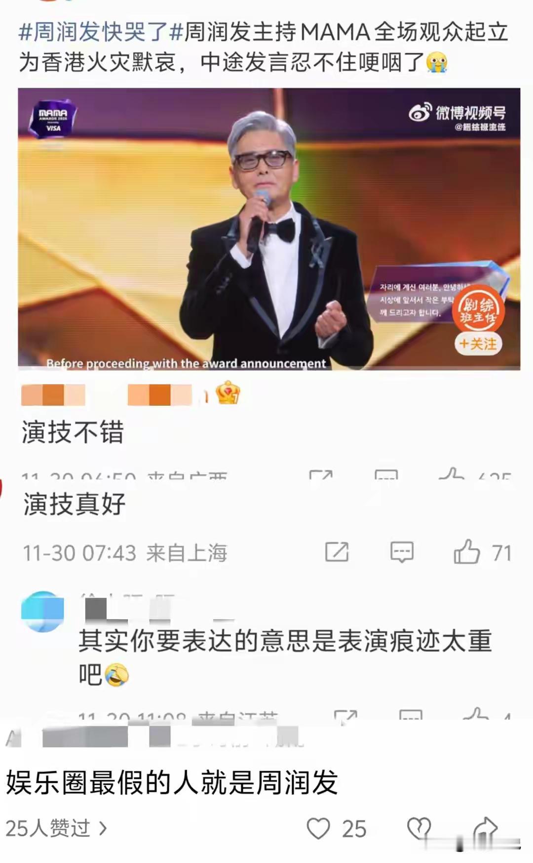 周润发现身香港MAMA含泪默哀却被骂上热搜 与权志龙舞台热舞引爆争议 背后真相令人心碎 (来源:大条娱纪) 当70岁的周润发顶着满头银发走上香港MAMA颁奖礼舞台时,无数人仿佛看到了《赌神》中那个叱咤风云的身影。然而这一次,他手中握着的不是扑克牌,而是一份沉甸甸的哀悼词。他用颤抖的声音,以普通话、粤语、英语三度带领全场为香港灾情默哀,眼眶泛红,几度哽咽。可这份庄重,竟在短短一小时后被全网贴上“表演痕迹太重”的标签。 镜头转向颁奖环节,周润发与十年未见的权志龙相遇。两人在舞台上相视而笑,即兴轻舞,仿佛忘掉了组委会的“禁笑令”。这幕画面瞬间点燃舆论——有人痛斥他“假慈悲”,有人却从中读出了劫后余生的释然。当善意被架上道德审判台,究竟是谁在定义“真假”? 网友翻出旧账:香港明星倾囊相助,内地艺人慷慨解囊,唯独周润发的捐款记录一片空白。但鲜有人知,他三十年来默默资助百余贫困学生,被问及时只摆手道:“小事情,不值得讲。”那些敲着键盘质问的人,可曾见过他凌晨四点独自清扫台风后的街道? 默哀时的泪光与颁奖时的笑容,本就该共存于真实的人生。我们习惯于将公众人物钉在“完美人设”的十字架上,却忘了他们也是血肉之躯。当灾难来临,难道非要哭着捐出全部身家才能自证清白?这种非黑即白的道德绑架,何尝不是另一种暴力? 权志龙弯腰九十度双手接奖杯的瞬间,周润发轻轻扶住他手肘。两个时代巨星的相惜,跨越了语言与国界。那些嘲讽“嬉皮笑脸”的人或许不懂,有些温暖恰恰诞生于至暗时刻。就像震后废墟中绽放的野花,微笑从来不是对苦难的背叛,而是向死而生的勇气。 翻开周润发的人生履历,从南丫岛穷小子到国际巨星,他始终活得像个“异类”:挤地铁、穿拖鞋买菜、将56亿身家全数捐出。这次MAMA典礼,他原本婉拒出席,最终站上舞台只因组委会承诺:所有嘉宾捐款将直送香港灾区。这世上多的是高调作秀的“慈善家”,少的是把善良活成本能的行者。 当舆论场陷入非此即彼的厮杀,我们是否该停下思考:为何总用最坏的恶意揣测他人?那个在暴雨中为流浪狗撑伞的背影,那个把摔倒老人背进医院的瞬间,比起捐款数字的罗列,这些琐碎的真实难道不更贴近善良的本质? 夜幕下的香港依旧霓虹闪烁,周润发的银发在舞台灯光下如雪如霜。他或许早已看透,被误解是表达者的宿命。但比骂声更震耳欲聋的,是默哀时全场寂静中那句破碎的“愿逝者安息”,是权志龙握紧他手掌时传来的温度。这个世界从不缺完美无瑕的圣人,缺的是从裂缝中透进来的光。 周润发争议 人性反思