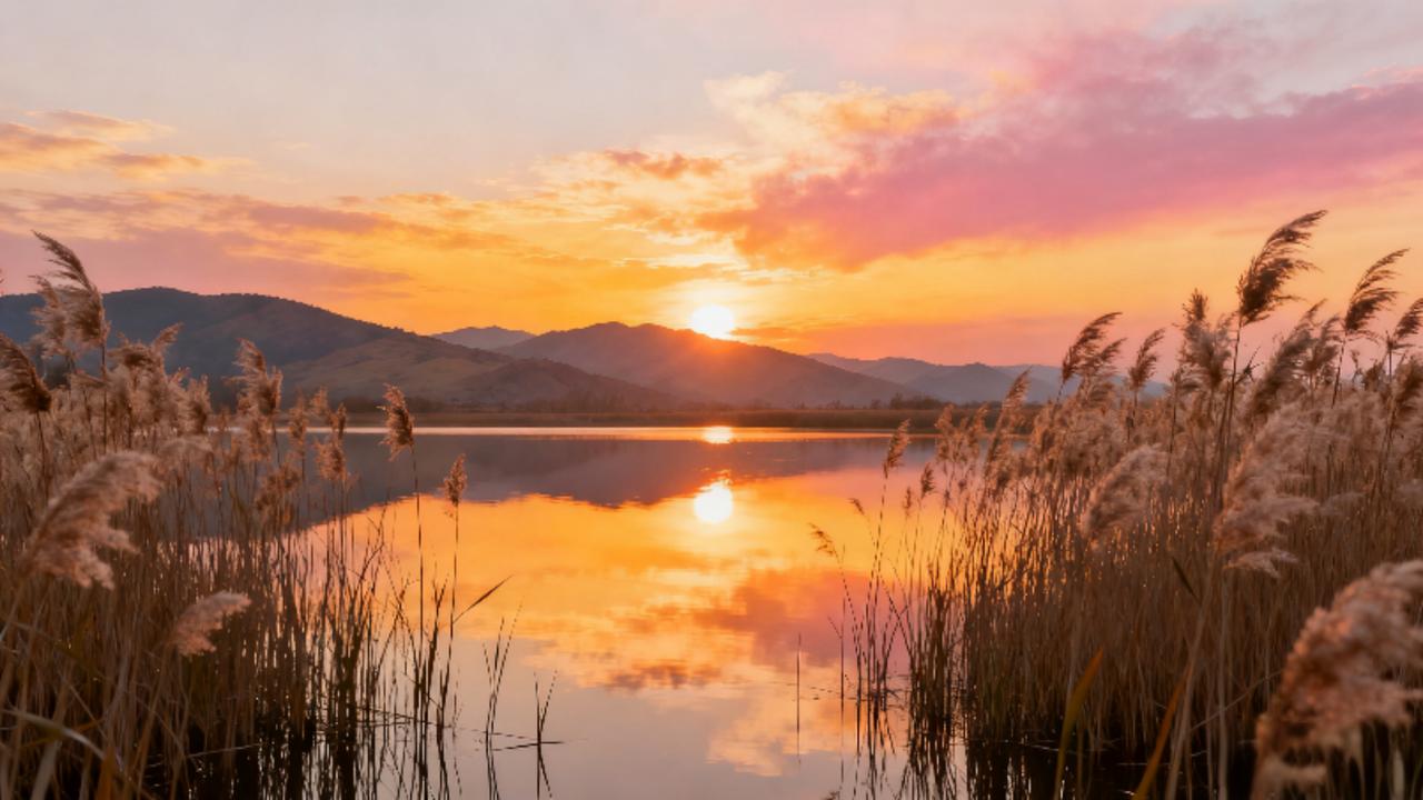 橙粉染天,落日沉山,芦苇摇着碎金般的光,让风都载着黄昏的温柔,漫向远方。