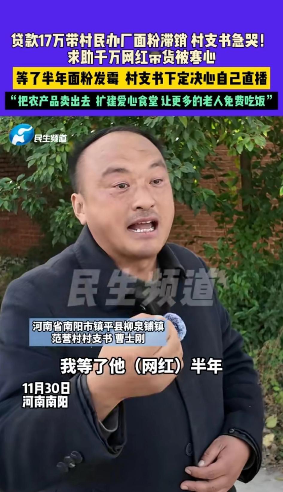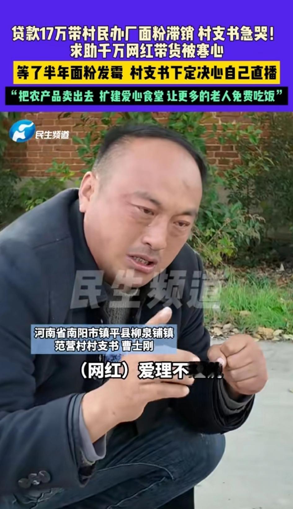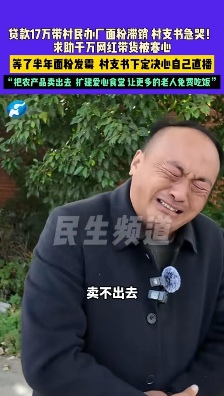 贷款17万带村民办面粉厂面粉滞销, 村支书:我们面粉厂的面粉都快长毛了,河南南阳市镇平县 柳泉铺镇范营村支书,面对镜头急的直哭! 求助千万网红带货被寒心。我们等他(网红)半年了对我们爱理不理的。现在面粉在厂子里快长毛了,一直没有销售出去。 一想到自己贷款17万带领村民办面粉厂,本来想带着大家致富呐,谁成想面粉滞销,本金都没收回来,眼看着面粉长毛,贷款到期,这位村支书面对镜头不顾形象的哭了起来。 俗话说男儿有泪不轻弹,只是未到作难处,更何况是个村支书。 现在好产品没有营销套路导致产品滞销,恶劣的产品倒是被各大平台推广,真是太不公平了。