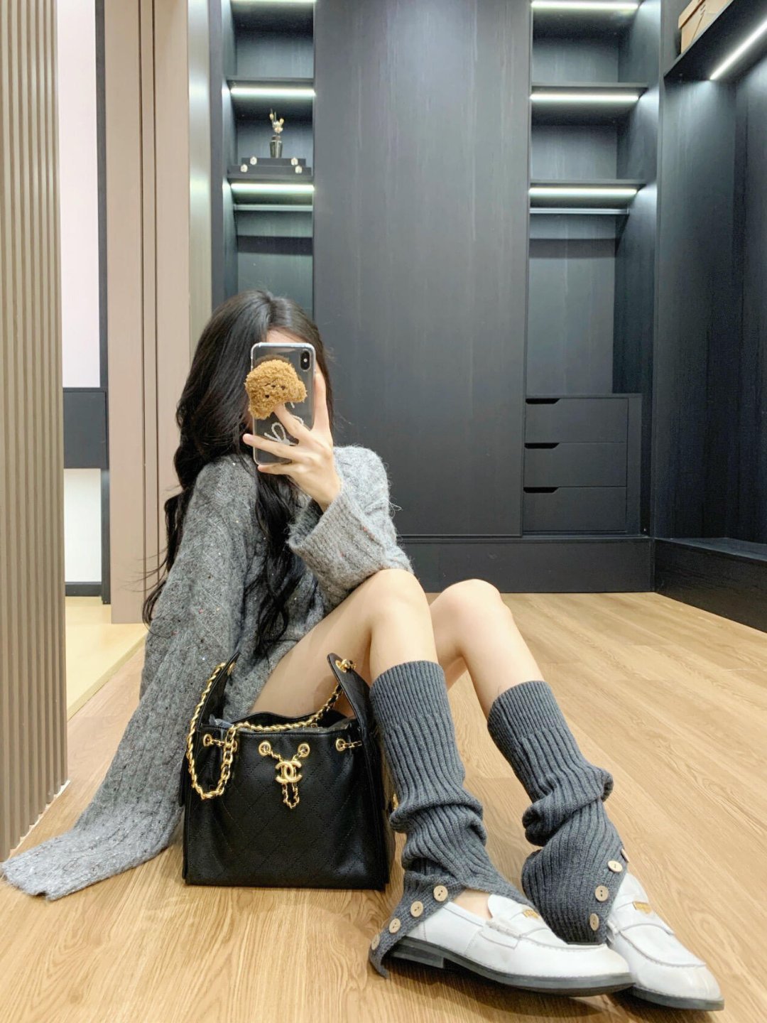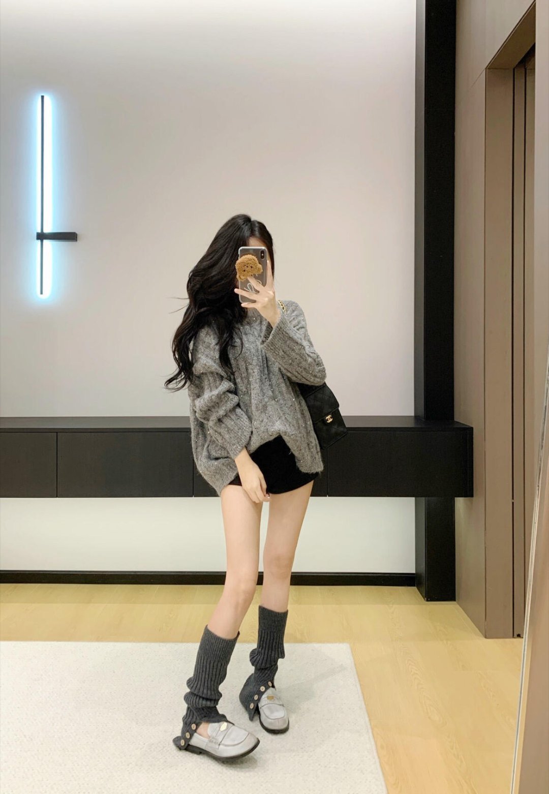 当然是黑色打底毛衣+外套黑色大衣+灰色连体袜不仅仅时尚还保暖