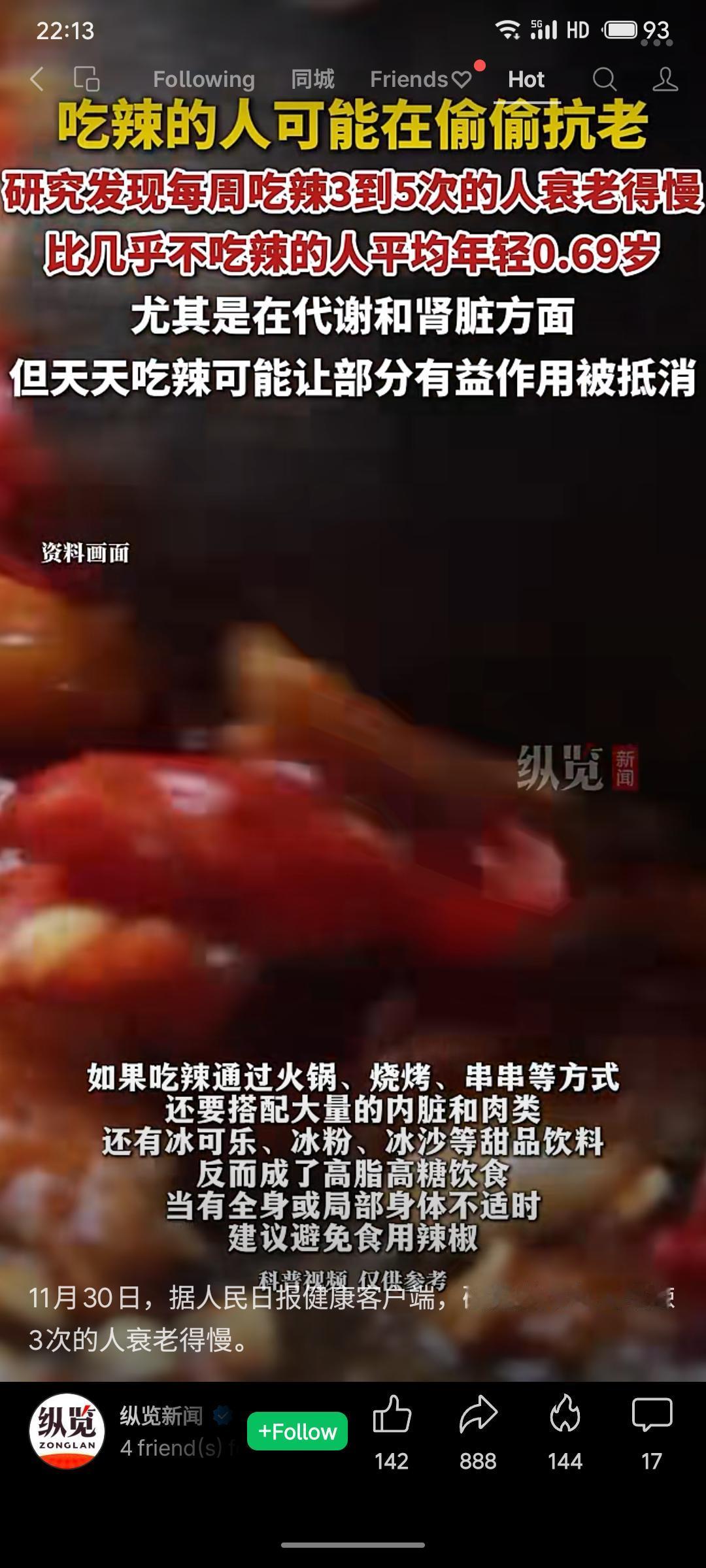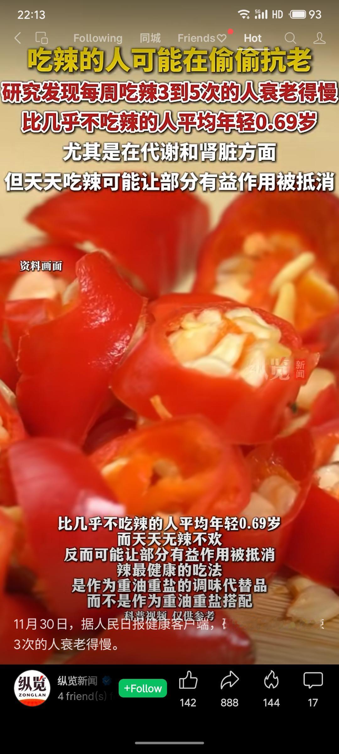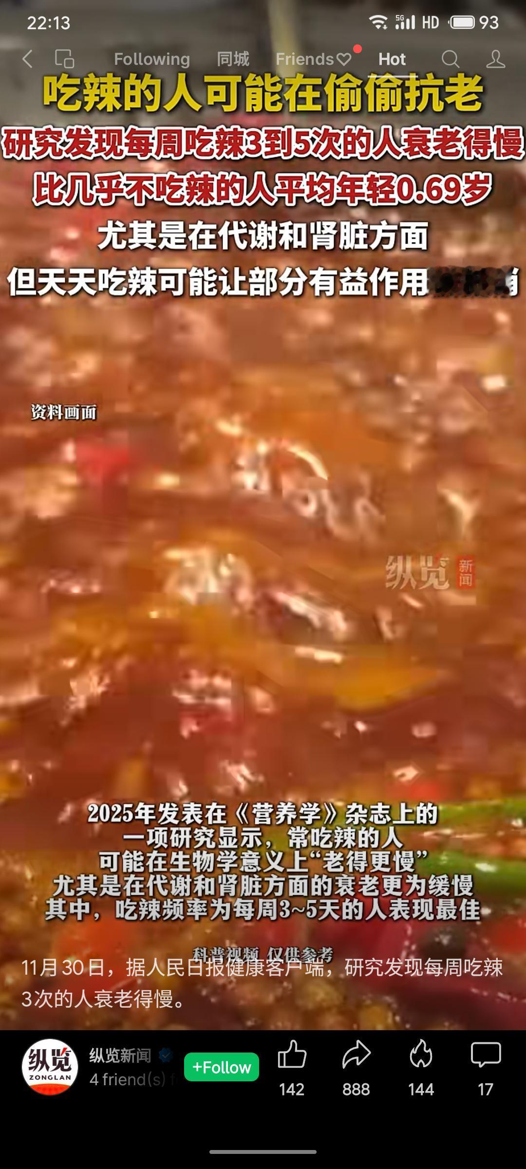 一项研究发现,适度吃辣或可延缓衰老。每周食用3至5次辣椒的人,其生物学年龄比几乎不吃辣的人平均年轻0.69岁,尤其在代谢和肾脏健康方面表现出优势。然而,研究也指出天天吃辣可能削弱益处,并强调辣椒应作为健康膳食的一部分,而非与高油高糖食物同食。