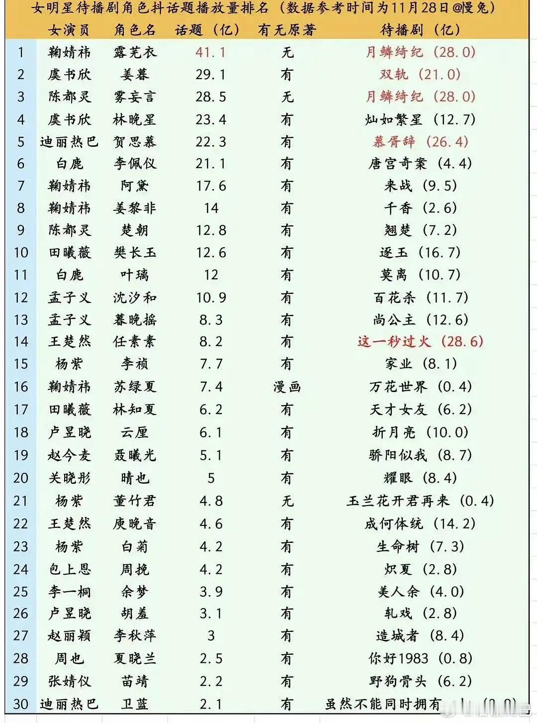 女明星待播剧抖角色话题播放排名前三:鞠婧祎、虞书欣、陈都灵