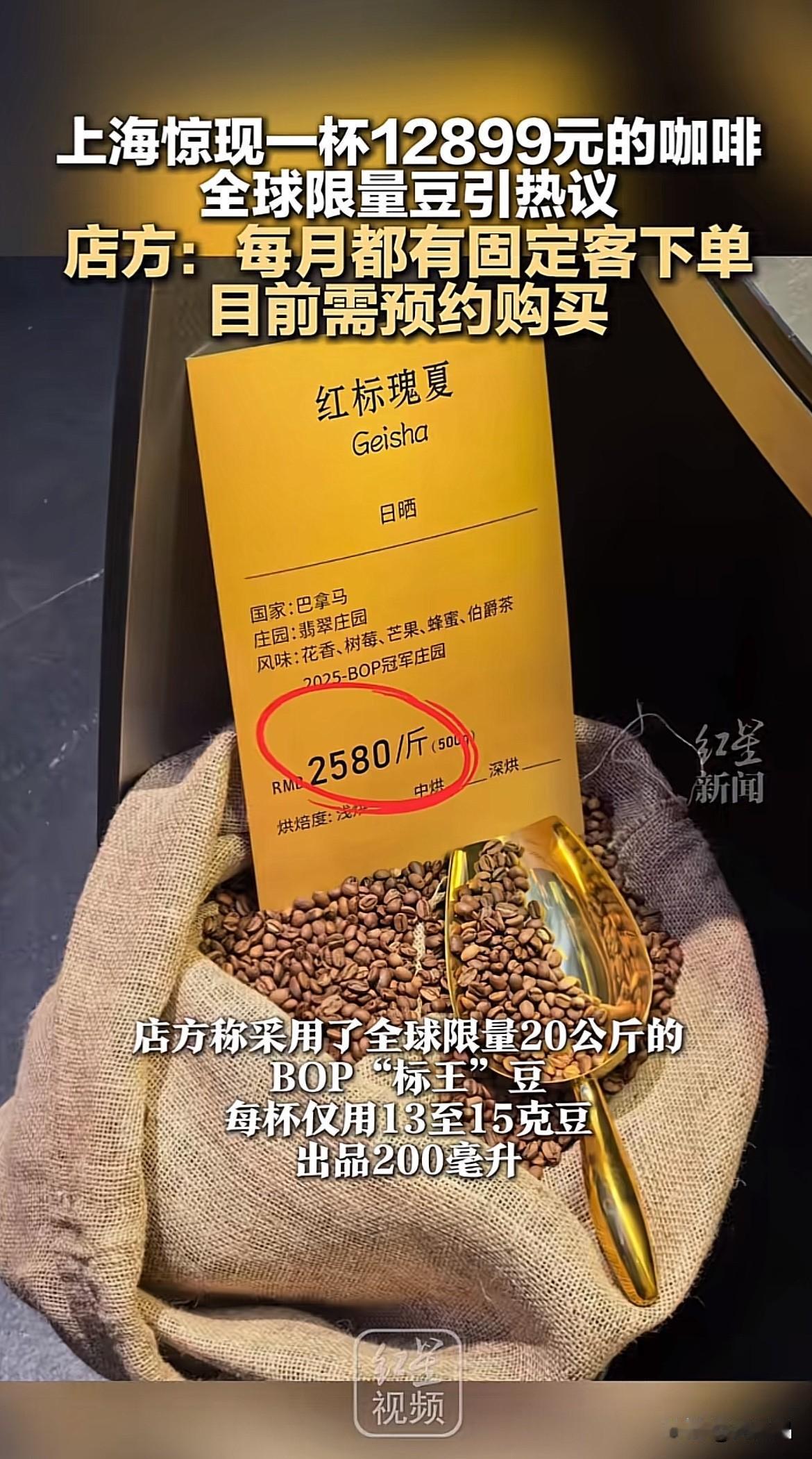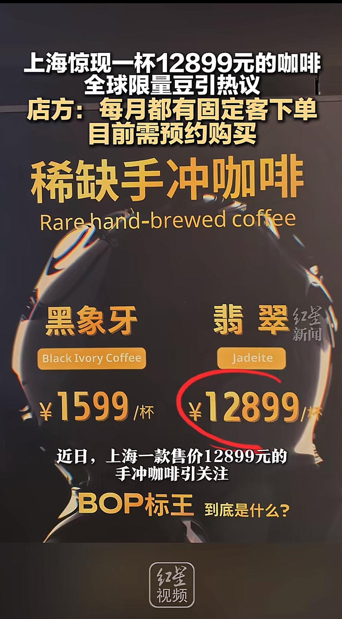 真是贫穷限制了我的想象力!上海一咖啡店一杯咖啡喝掉普通人一个月工资,店员回应需要预约才能喝。 上海外滩这家咖啡店因为售卖12899元一杯的咖啡火出圈。店员介绍这款天价咖啡采用的是BOP标王咖啡豆,产自巴拿马的翡翠庄园,全球限量20kg,喝的就是稀缺性。 有网友说,给我一杯12899的咖啡,我也喝不出,它和9块9一杯的有啥区别。 也有网友说,弱弱地问一句,到底是哪些人在喝?喝了这杯天价咖啡能多活几分钟吗? 还有网友说,我图你的是什么花香果香和口感丰富吗?牛马的我只需要咖啡因就好了呀,喝咖啡万只喝公司咖啡机的免费咖啡。 有钱人喝天价咖啡喝的是“我喝到了你喝不到的咖啡”那种优越感感,稀缺性体验是社交圈的谈资,金字塔顶端的身份认证。 普通人不是喝不起,攒攒钱也能喝,而是没必要,普通生活的柴米油盐里配9块9的咖啡更有性价比。
