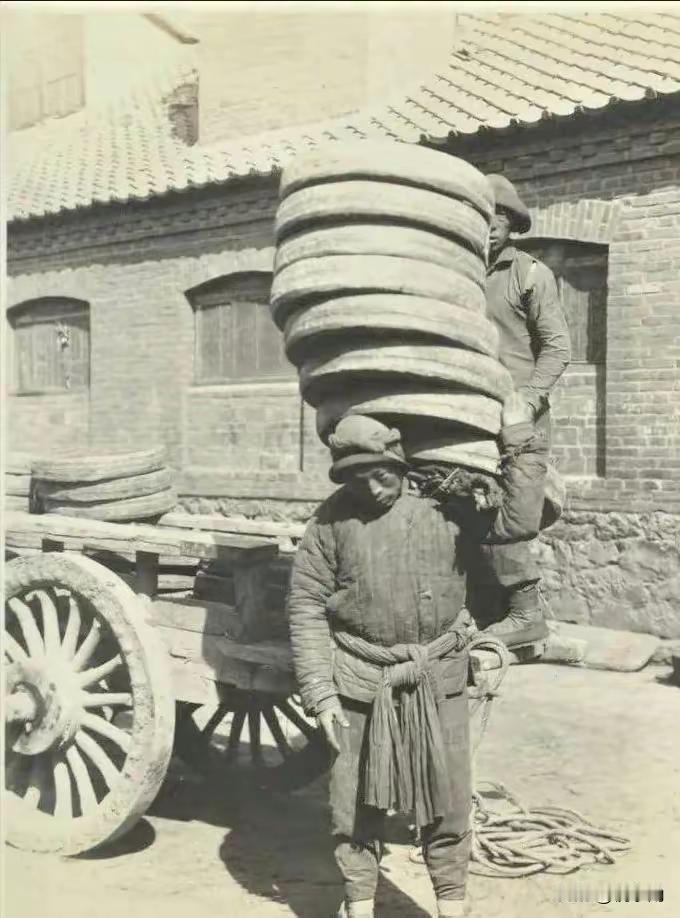 旧社会的真实生活是咋样的呢? 先看这个街头正在乞讨的小乞丐,孩子大约十几岁的样子,左手拿着一个碗,右手拿着筷子和布袋,穿着还不算最破烂,有可能就是家道中落家中发生了大的变故,不得已才上街乞讨为生吧! 看看运送货物的青壮劳力,凭着自己的一把子力气靠着扛活养活家人,只要能吃饱,没有什么是自己不愿意干的,更不像现在的年轻人还能挑挑拣拣。可以看出他的劳动量实在是很大! 以前家里没有牲畜的家庭,只能全家上阵代替牲畜来劳作,在那个残酷的年代又有多少家庭有牲畜呢,恐怕也是寥寥无几吧!