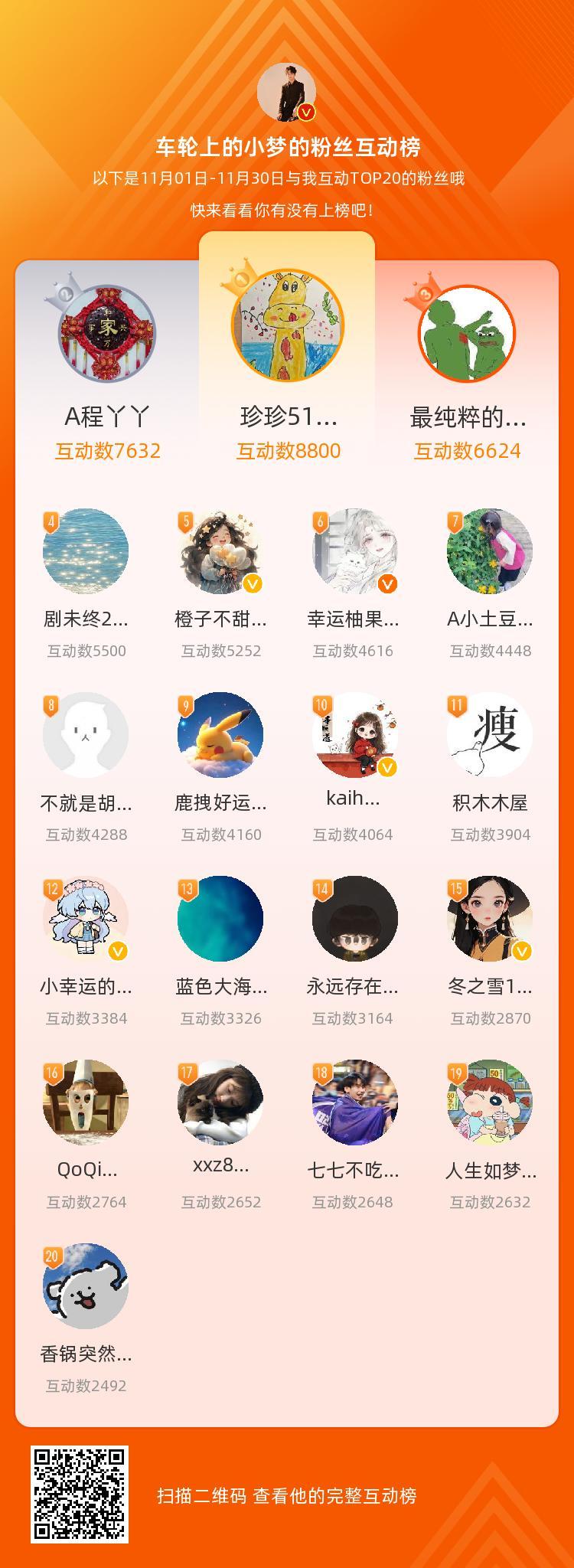 小梦狂宠粉丝 11月互动排行榜来咯!老规矩,带排名私信我哦,截止到12月3日24