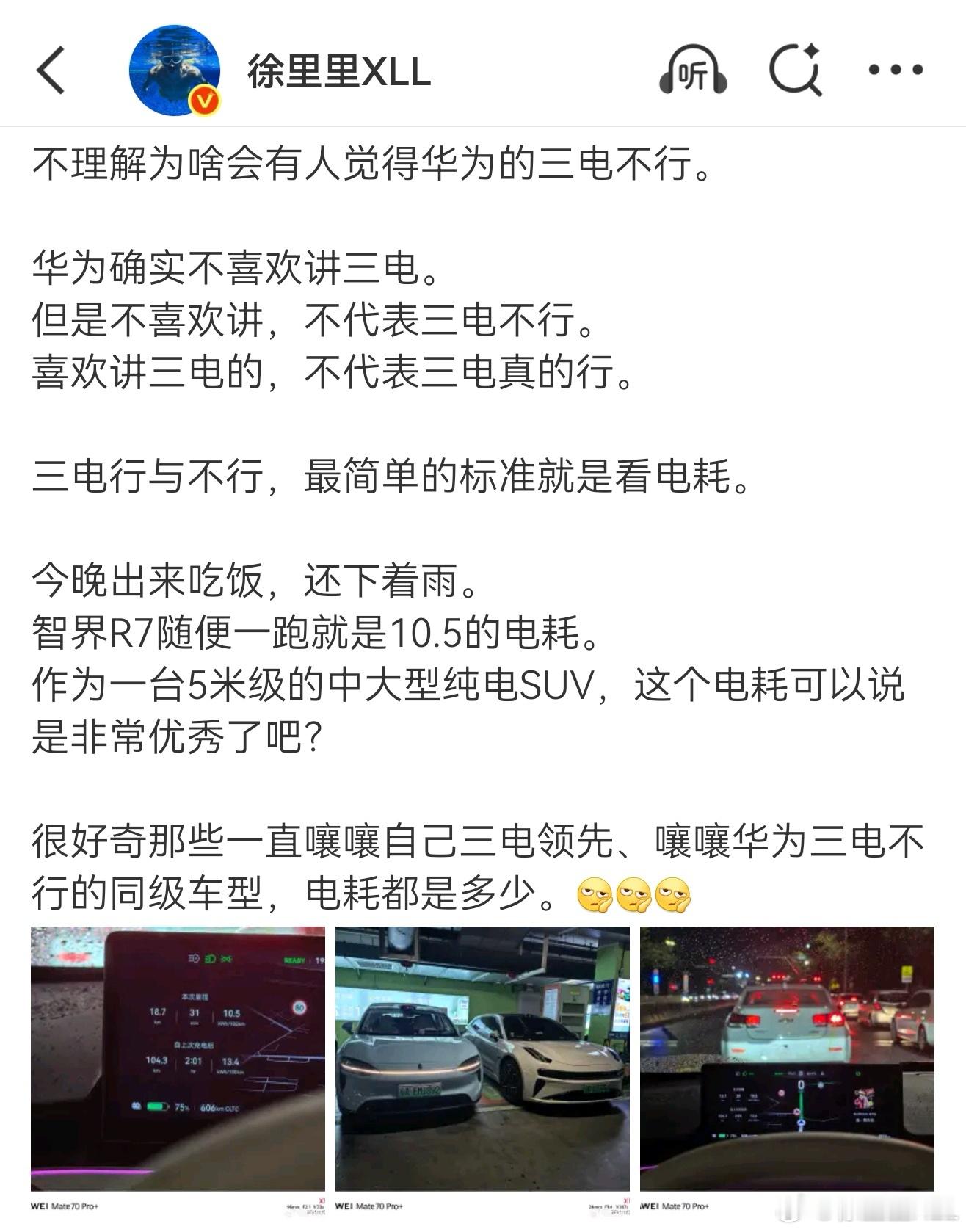 刚说完,就来了。7点左右的晚高峰,怎么就成极限工况了?智界R7的工信部黄纸就是13.1啊。怎么了?我不把工信部黄纸贴出来,不是为了照顾华为。而是为了照顾你。如果我贴了,是不是也得顺手把你17.4的同级竞品也贴出来?这是不是不利于团结?