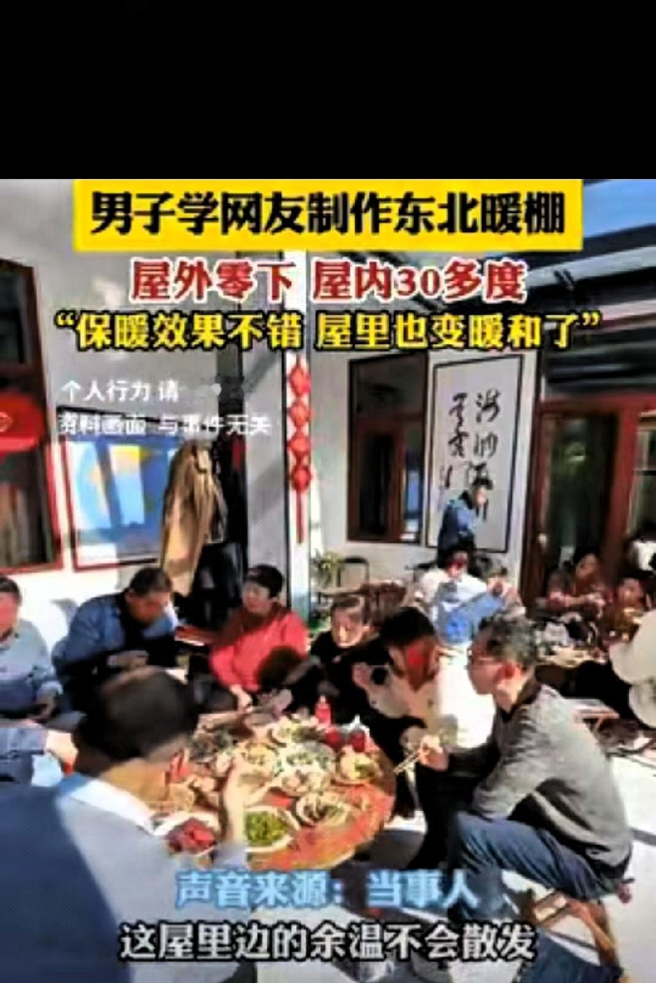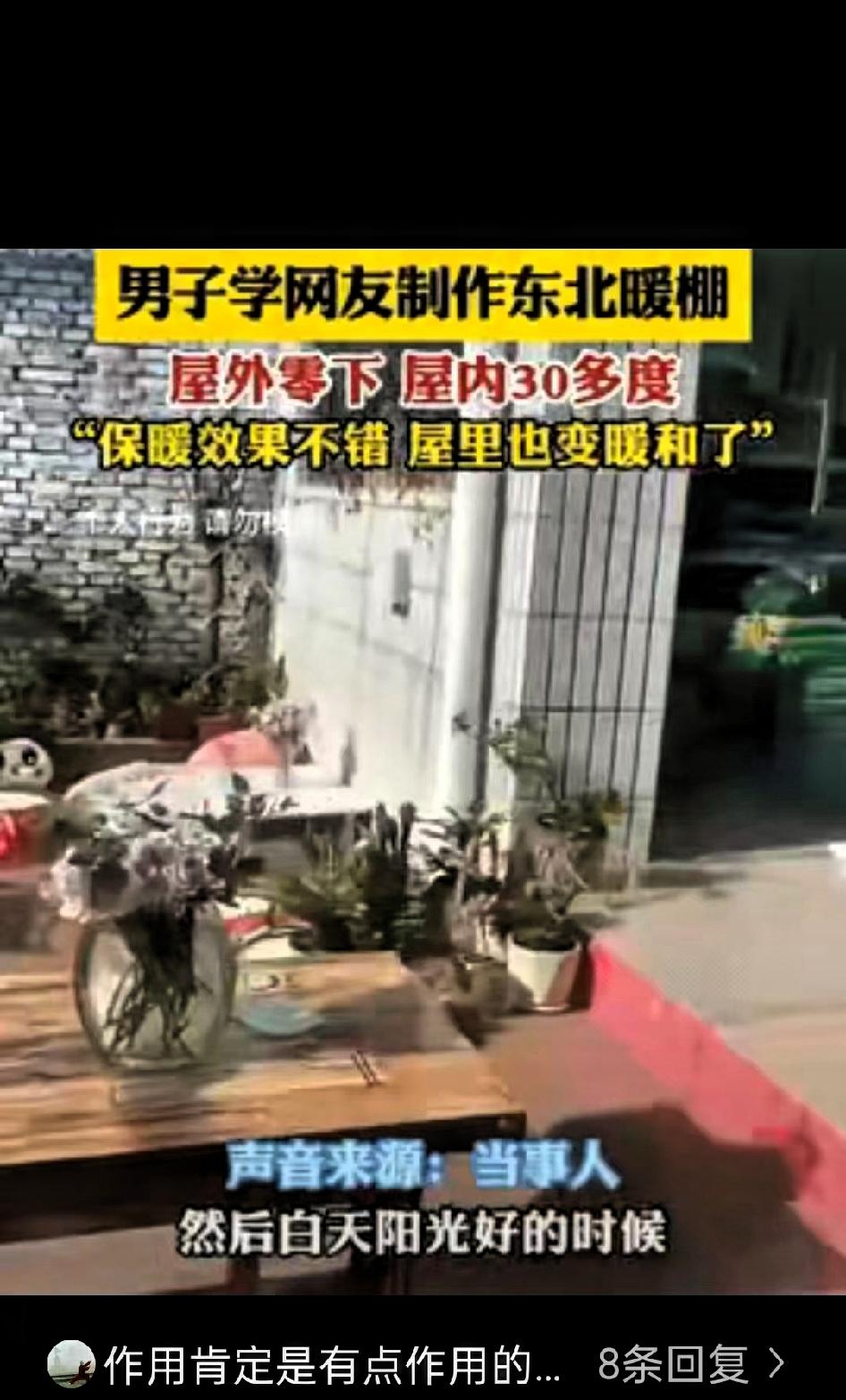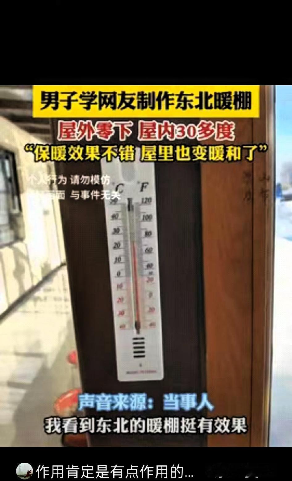 “太有头脑了”!河北石家庄,男子为了省钱应对零下天气,竟然花1000多,学网友制作东北暖棚 不仅让棚内温度保持在舒适范围,还解决了老人怕冷又舍不得多花钱取暖的困扰,引来不少人点赞。 冬天里,长辈畏寒却心疼电费,不愿长时间开空调,使用煤气取暖又存在安全隐患,这是很多家庭都面临的情况。这位大哥看在眼里,一直想找个既安全又经济的取暖方式。 一次刷手机时,他看到东北农户搭建阳光暖棚过冬的视频,发现这种依靠太阳能取暖的方式既环保又省钱,便决定效仿。 利用自家房屋南向的采光优势,大哥准备好材料后,和家人忙活了一个下午,就将暖棚搭建完成,刚好包裹住房屋的整面南墙。白天有阳光时,暖棚能充分吸收热量,内部温度可达30-38度,热量还能传递到屋内,让里屋温度稳定在22度左右,老人在室内穿薄外套就足够暖和。 到了夜间,只需在暖棚外覆盖一层旧棉被或厚布保温,第二天清晨棚内温度仍能保持在17-18度,家里的电热毯也很少再使用。这种暖棚后续维护成本极低,即便第二年塑料布需要更换,花费也仅几十元,相比每月几百元的空调电费,大大降低了冬季取暖开支。 网友们纷纷表示,这种取暖方式既贴心又实用,真正的孝心不是强迫老人改变习惯,而是用智慧改善生活环境。其实生活中很多难题,只要肯动脑筋,总能找到接地气的解决办法。