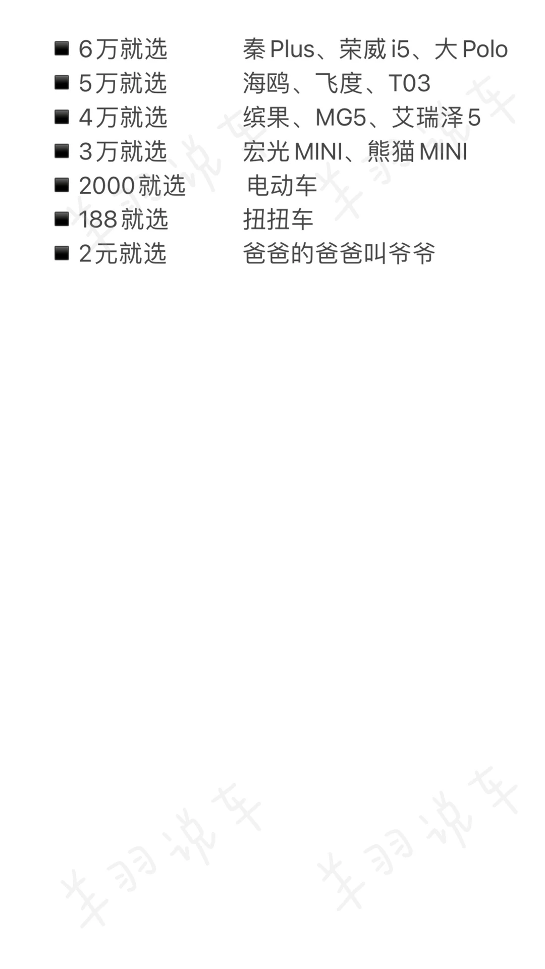 🤔️买车不要问太多人,因为每个人的用车场景不一样,有人觉得电车好,有人觉得油车好,有人觉得要买SUV,有人觉得买轿车,所以,买车就看自己的口袋,口袋有多少,就选什么车。