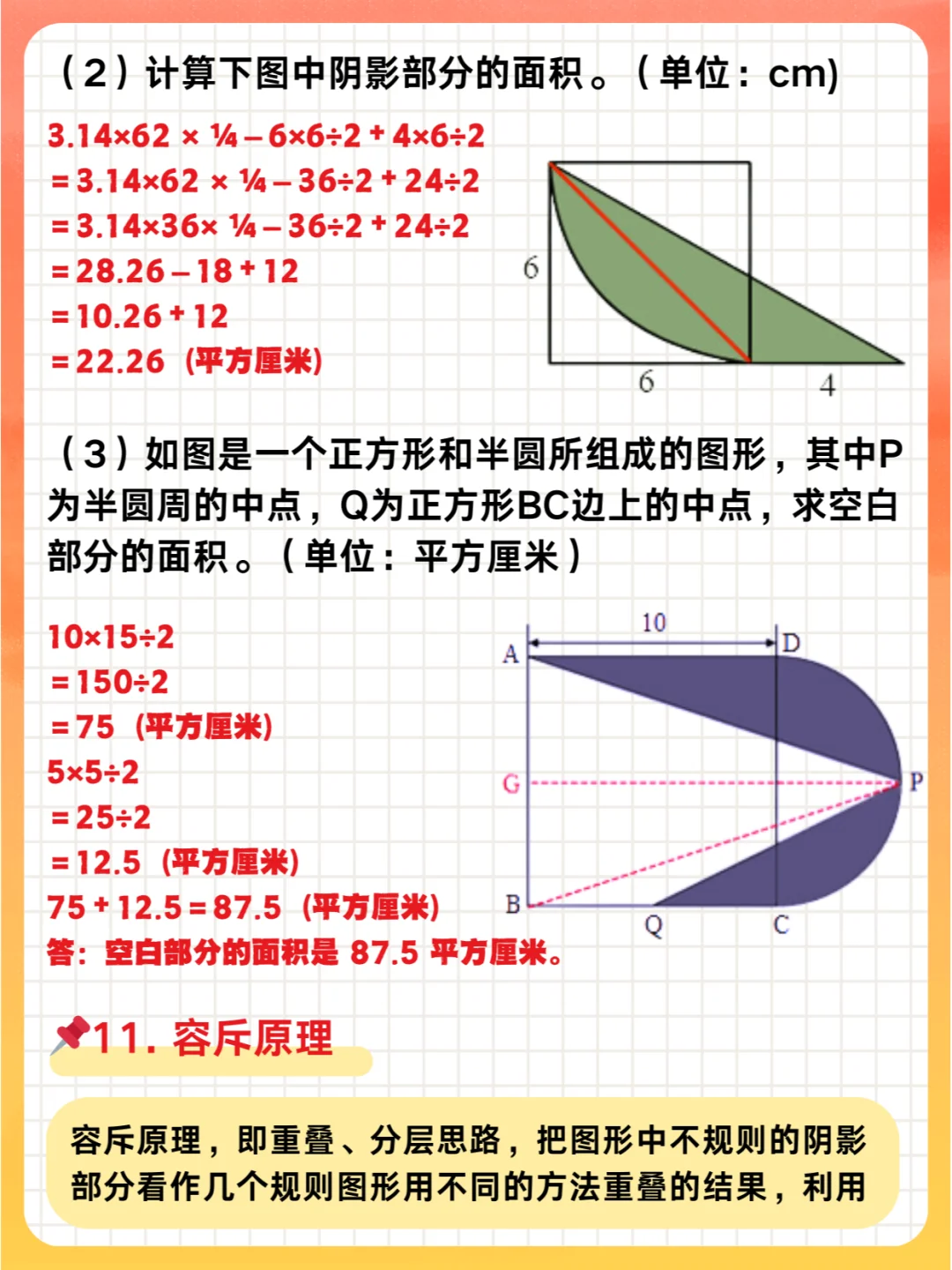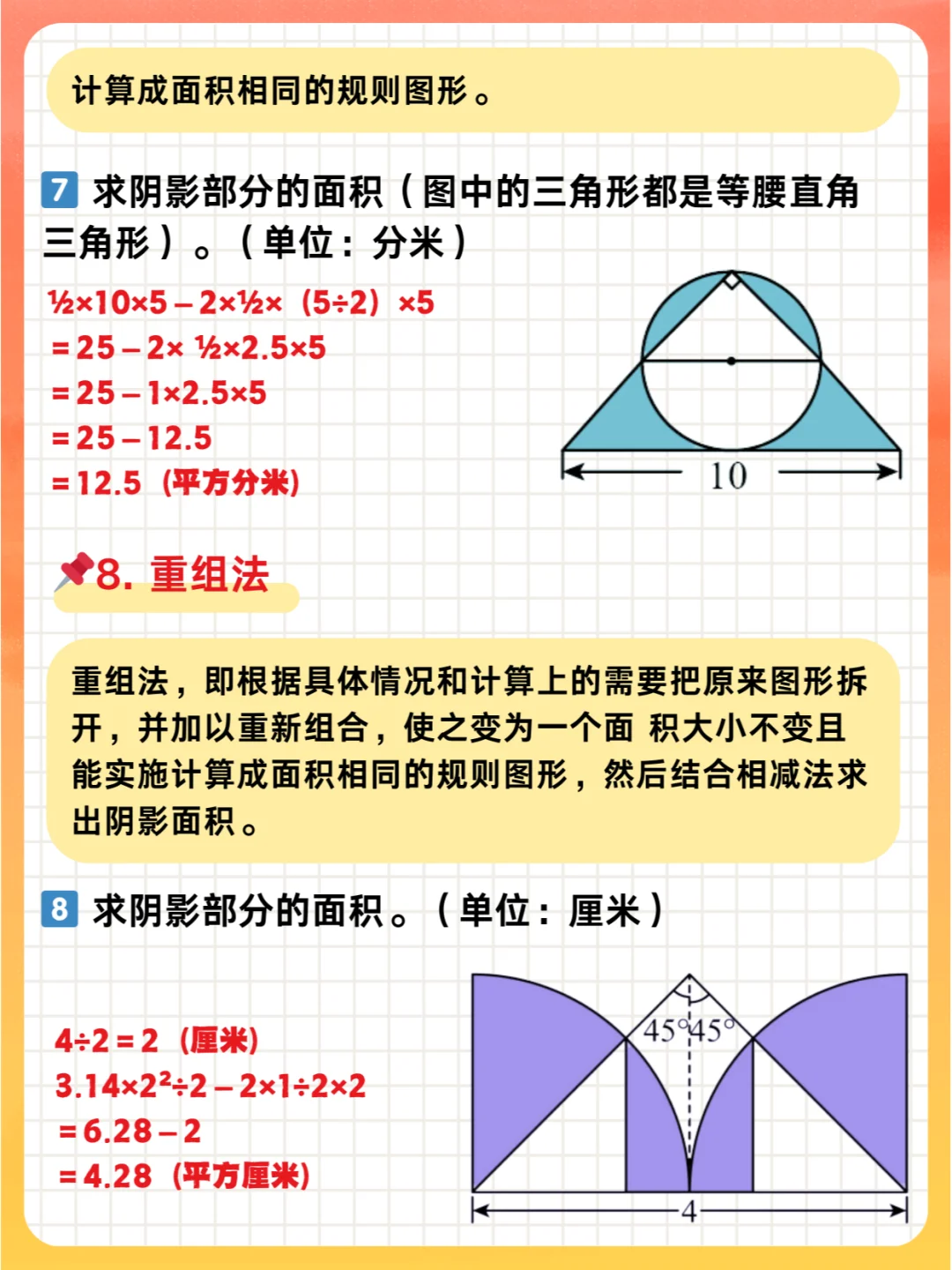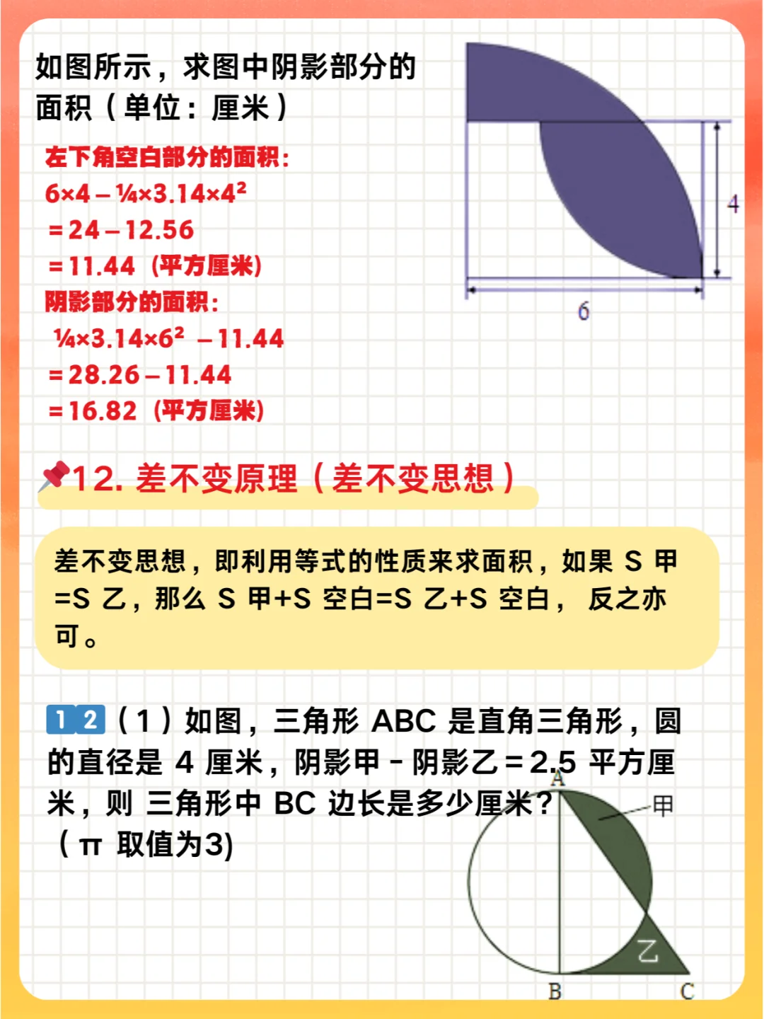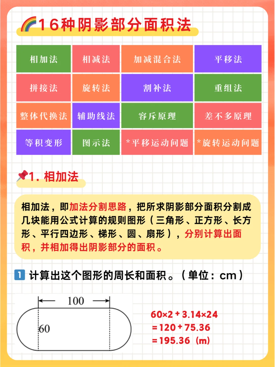 🌈六年级:小升初 几何 求阴影部分面积1️⃣6️⃣种解题方法大汇总,授人以鱼不如授人以渔,掌握方法,才能举一反三,避免无效刷题✅ 1️⃣相加法:即加法分割思路,把所求阴影部分面积分割成几块能用公式计算的规则图形,分别计算出面积,并相加得出阴影部分的面积。 2️⃣ 相减法:即减法拓展思路,是把不规则图形阴影部分面积拓展到包含阴影部分的规则图形中进行分析,通过计算这个规则图形的面积和规则图形中除阴影部分面积之外多余的面积,运用“总的”减去“部分的”方法解得答案。 3️⃣ 加减混合法 :混合型图形处理起来非常困难,可以首先观察图形,然后合理分解成部分可求的图形,最后再相加减。 4️⃣ 平移法 :即通过把部分图形平行移动可以把不规则图形转变为已学的规则图形,进而求出图形的面积。 5️⃣ 拼接法 :即在部分扇形半径相等的情况下,可以通过移动扇形,把扇形拼接成一个整体。 6️⃣ 旋转法 :又叫翻转法,即根据图形的特征,将原图的某一部分进行翻转或旋转,最后得到便于求 解的新图形。 7️⃣ 割补法 :即分割拼补的思路,是把不规则的阴影面积通过分割和拼补,使之变为一个面积大小 不变且能实施计算成面积相同的规则图形。 8️⃣ 重组法 :即根据具体情况和计算上的需要把原来图形拆开,并加以重新组合,使之变为一个面 积大小不变且能实施计算成面积相同的规则图形,然后结合相减法求出阴影面积。 9️⃣ 整体代换法 :即通过平面图形之间的等量关系,将图形面积整体代换,再根据相应面积公式求出面积。 🔟 辅助线法 :即在通常手段无法求出阴影部分面积时,需要尝试使用添加辅助线的方法解决。 1️⃣ 1️⃣ 容斥原理 :即重叠、分层思路,把图形中不规则的阴影部分看作几个规则图形用不同的方法重叠的结果,利用分层把重叠部分分出来,组成重叠图形各个规则图形的面积总和减去分掉的那面积,就是剩下所求那部分面积。 1️⃣ 2️⃣ 差不多原理 :即利用等式的性质来求面积,如果 S 甲=S 乙,那么 S 甲+S 空白=S 乙+S 空白, 反之亦可。 1️⃣ 3️⃣ 等积变形 :即利用等底等高,面积相等的特性,将不能求出的图形转化为面积与之相等的图形。 1️⃣ 4️⃣ 图示法 :即先根据题意,画出图形的轨迹,再求面积。 ……