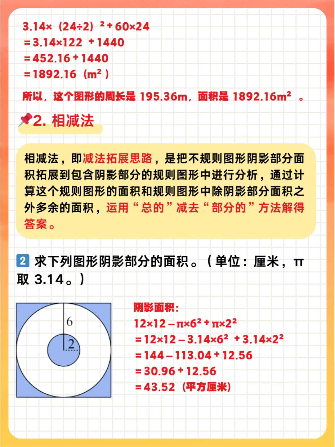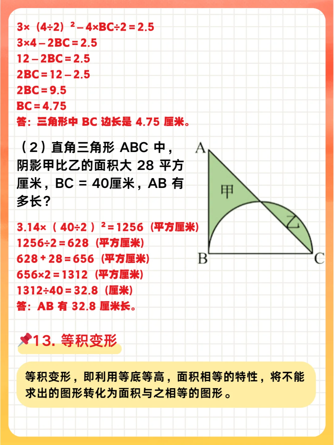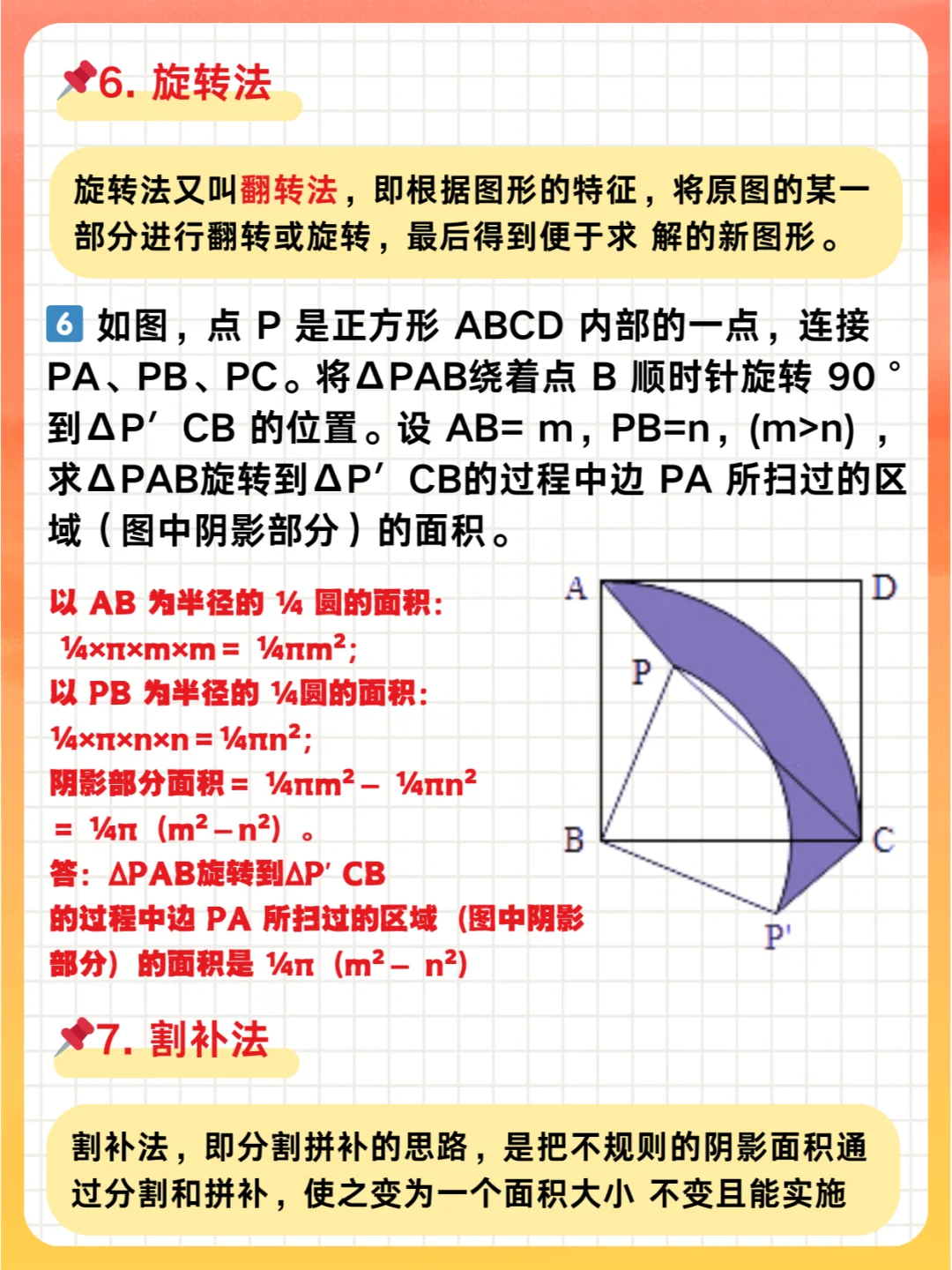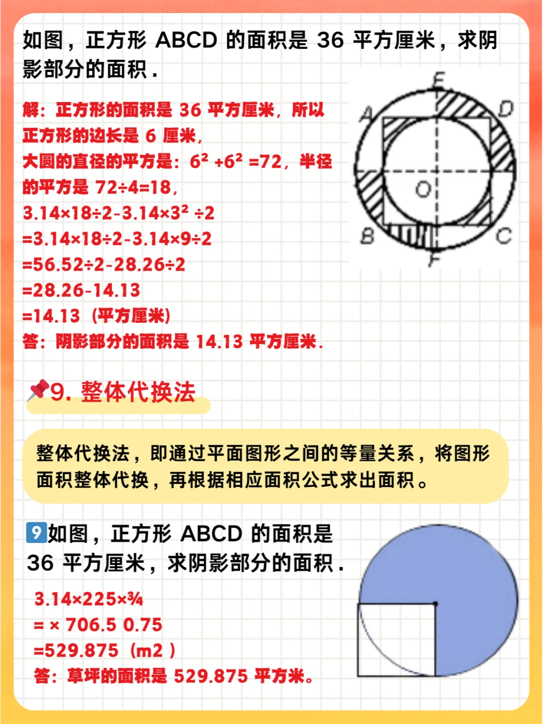 🌈六年级:小升初 几何 求阴影部分面积1️⃣6️⃣种解题方法大汇总,授人以鱼不如授人以渔,掌握方法,才能举一反三,避免无效刷题✅ 1️⃣相加法:即加法分割思路,把所求阴影部分面积分割成几块能用公式计算的规则图形,分别计算出面积,并相加得出阴影部分的面积。 2️⃣ 相减法:即减法拓展思路,是把不规则图形阴影部分面积拓展到包含阴影部分的规则图形中进行分析,通过计算这个规则图形的面积和规则图形中除阴影部分面积之外多余的面积,运用“总的”减去“部分的”方法解得答案。 3️⃣ 加减混合法 :混合型图形处理起来非常困难,可以首先观察图形,然后合理分解成部分可求的图形,最后再相加减。 4️⃣ 平移法 :即通过把部分图形平行移动可以把不规则图形转变为已学的规则图形,进而求出图形的面积。 5️⃣ 拼接法 :即在部分扇形半径相等的情况下,可以通过移动扇形,把扇形拼接成一个整体。 6️⃣ 旋转法 :又叫翻转法,即根据图形的特征,将原图的某一部分进行翻转或旋转,最后得到便于求 解的新图形。 7️⃣ 割补法 :即分割拼补的思路,是把不规则的阴影面积通过分割和拼补,使之变为一个面积大小 不变且能实施计算成面积相同的规则图形。 8️⃣ 重组法 :即根据具体情况和计算上的需要把原来图形拆开,并加以重新组合,使之变为一个面 积大小不变且能实施计算成面积相同的规则图形,然后结合相减法求出阴影面积。 9️⃣ 整体代换法 :即通过平面图形之间的等量关系,将图形面积整体代换,再根据相应面积公式求出面积。 🔟 辅助线法 :即在通常手段无法求出阴影部分面积时,需要尝试使用添加辅助线的方法解决。 1️⃣ 1️⃣ 容斥原理 :即重叠、分层思路,把图形中不规则的阴影部分看作几个规则图形用不同的方法重叠的结果,利用分层把重叠部分分出来,组成重叠图形各个规则图形的面积总和减去分掉的那面积,就是剩下所求那部分面积。 1️⃣ 2️⃣ 差不多原理 :即利用等式的性质来求面积,如果 S 甲=S 乙,那么 S 甲+S 空白=S 乙+S 空白, 反之亦可。 1️⃣ 3️⃣ 等积变形 :即利用等底等高,面积相等的特性,将不能求出的图形转化为面积与之相等的图形。 1️⃣ 4️⃣ 图示法 :即先根据题意,画出图形的轨迹,再求面积。 ……