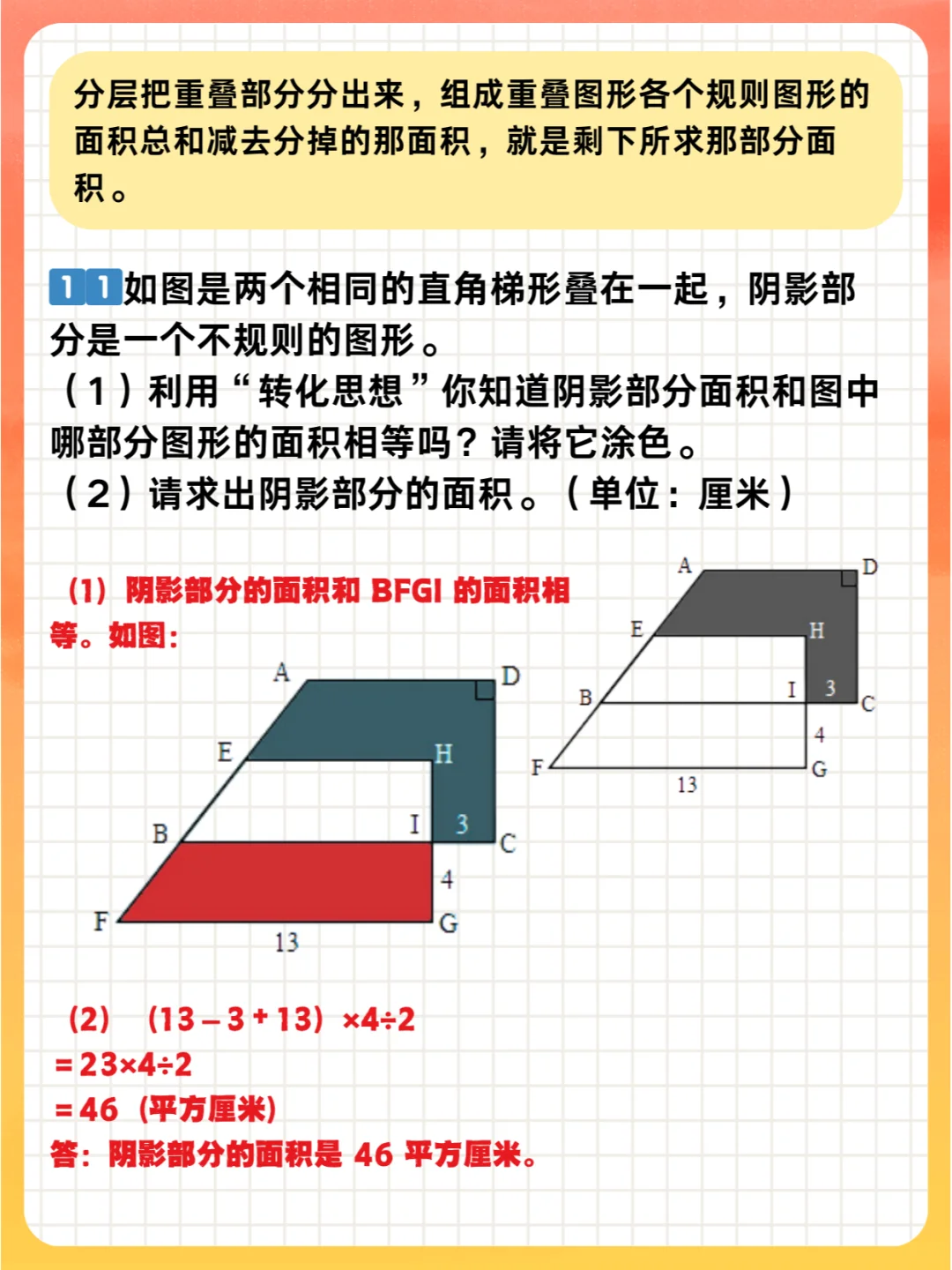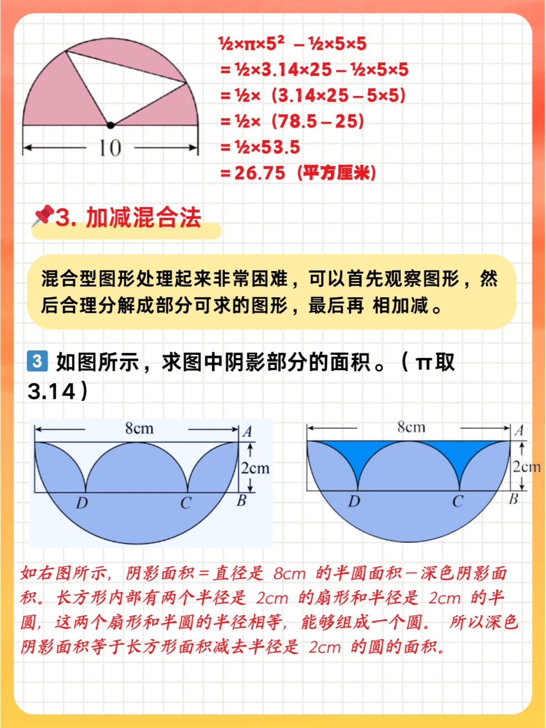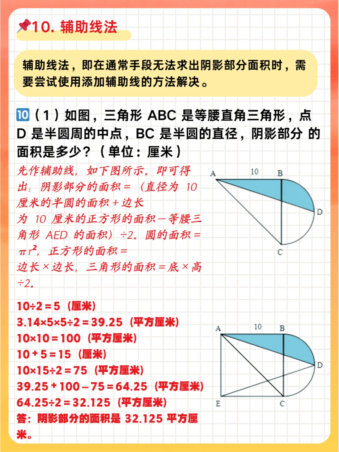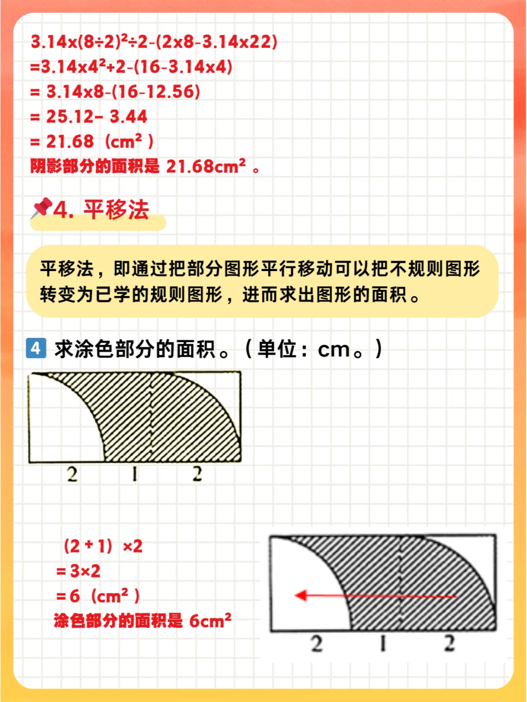 🌈六年级:小升初 几何 求阴影部分面积1️⃣6️⃣种解题方法大汇总,授人以鱼不如授人以渔,掌握方法,才能举一反三,避免无效刷题✅ 1️⃣相加法:即加法分割思路,把所求阴影部分面积分割成几块能用公式计算的规则图形,分别计算出面积,并相加得出阴影部分的面积。 2️⃣ 相减法:即减法拓展思路,是把不规则图形阴影部分面积拓展到包含阴影部分的规则图形中进行分析,通过计算这个规则图形的面积和规则图形中除阴影部分面积之外多余的面积,运用“总的”减去“部分的”方法解得答案。 3️⃣ 加减混合法 :混合型图形处理起来非常困难,可以首先观察图形,然后合理分解成部分可求的图形,最后再相加减。 4️⃣ 平移法 :即通过把部分图形平行移动可以把不规则图形转变为已学的规则图形,进而求出图形的面积。 5️⃣ 拼接法 :即在部分扇形半径相等的情况下,可以通过移动扇形,把扇形拼接成一个整体。 6️⃣ 旋转法 :又叫翻转法,即根据图形的特征,将原图的某一部分进行翻转或旋转,最后得到便于求 解的新图形。 7️⃣ 割补法 :即分割拼补的思路,是把不规则的阴影面积通过分割和拼补,使之变为一个面积大小 不变且能实施计算成面积相同的规则图形。 8️⃣ 重组法 :即根据具体情况和计算上的需要把原来图形拆开,并加以重新组合,使之变为一个面 积大小不变且能实施计算成面积相同的规则图形,然后结合相减法求出阴影面积。 9️⃣ 整体代换法 :即通过平面图形之间的等量关系,将图形面积整体代换,再根据相应面积公式求出面积。 🔟 辅助线法 :即在通常手段无法求出阴影部分面积时,需要尝试使用添加辅助线的方法解决。 1️⃣ 1️⃣ 容斥原理 :即重叠、分层思路,把图形中不规则的阴影部分看作几个规则图形用不同的方法重叠的结果,利用分层把重叠部分分出来,组成重叠图形各个规则图形的面积总和减去分掉的那面积,就是剩下所求那部分面积。 1️⃣ 2️⃣ 差不多原理 :即利用等式的性质来求面积,如果 S 甲=S 乙,那么 S 甲+S 空白=S 乙+S 空白, 反之亦可。 1️⃣ 3️⃣ 等积变形 :即利用等底等高,面积相等的特性,将不能求出的图形转化为面积与之相等的图形。 1️⃣ 4️⃣ 图示法 :即先根据题意,画出图形的轨迹,再求面积。 ……
