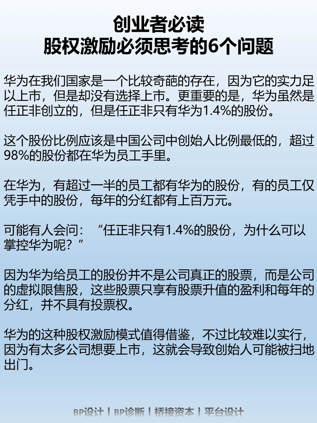 华为的这种股权激励模式值得借鉴,不过比较难以实行,因为有太多公司想要上市,这就会导致创始人可能被扫地出门。