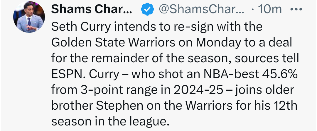 库里来了!赛斯预计在当地时间周一与勇士签约至本赛季结束。金州勇士