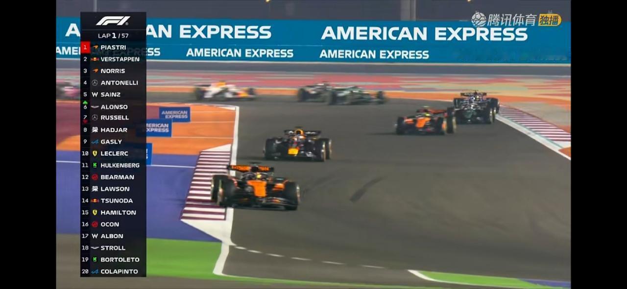 灯灭起步!诺里斯高压之下果然犯错。 皮亚斯特里领跑,维斯塔潘超越诺里斯上到P2。 今天有好戏上演,一定能看到你们想看的。