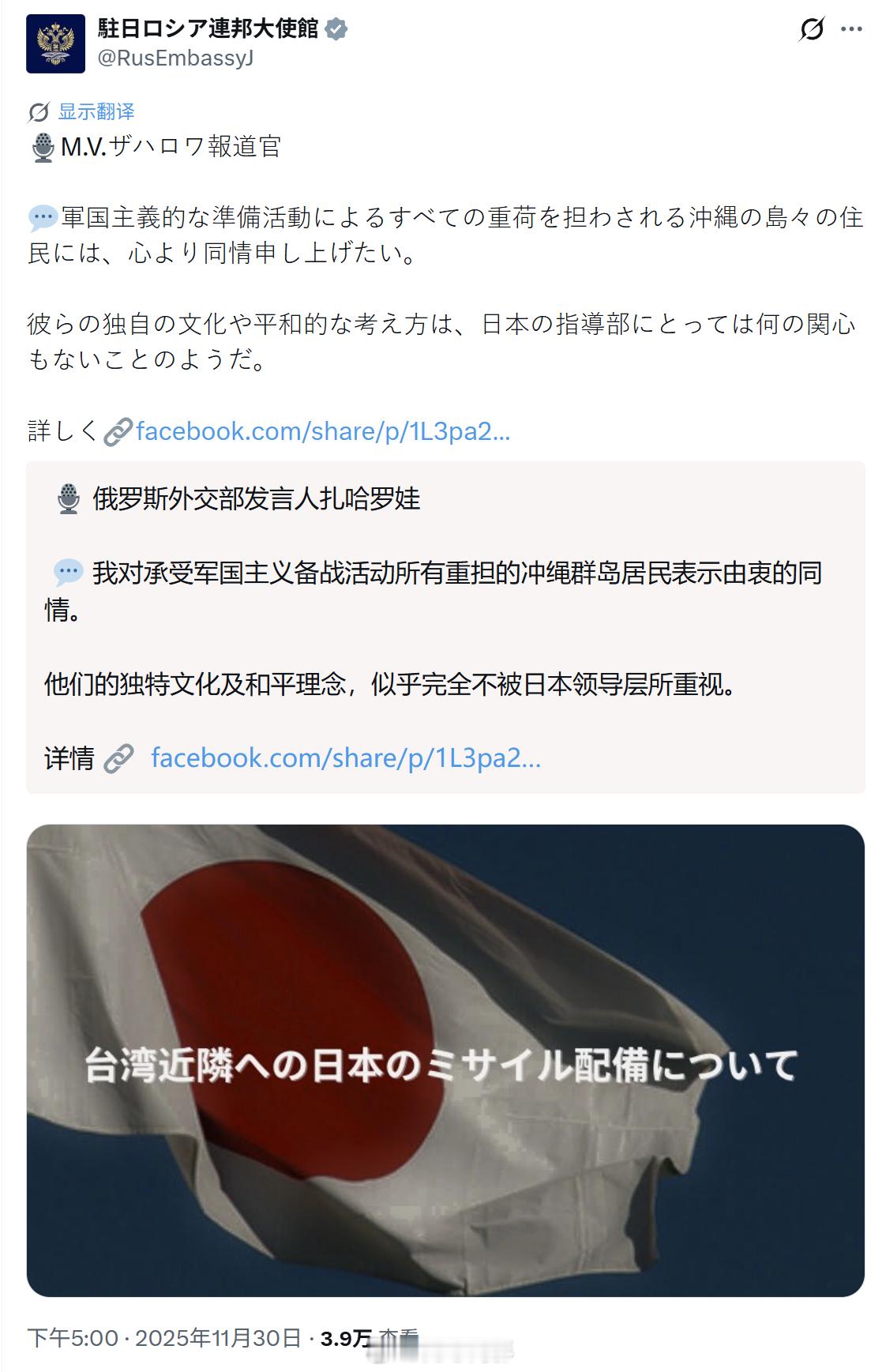 本次中日冲突,俄罗斯是坚定站在中国一边,不但扎哈罗娃三度发声斥责日本,大使馆帐号也没闲着,而且还是在聊琉球,很好,琉球的问题就该全世界都聊聊。海外新鲜事日本不要高估自己