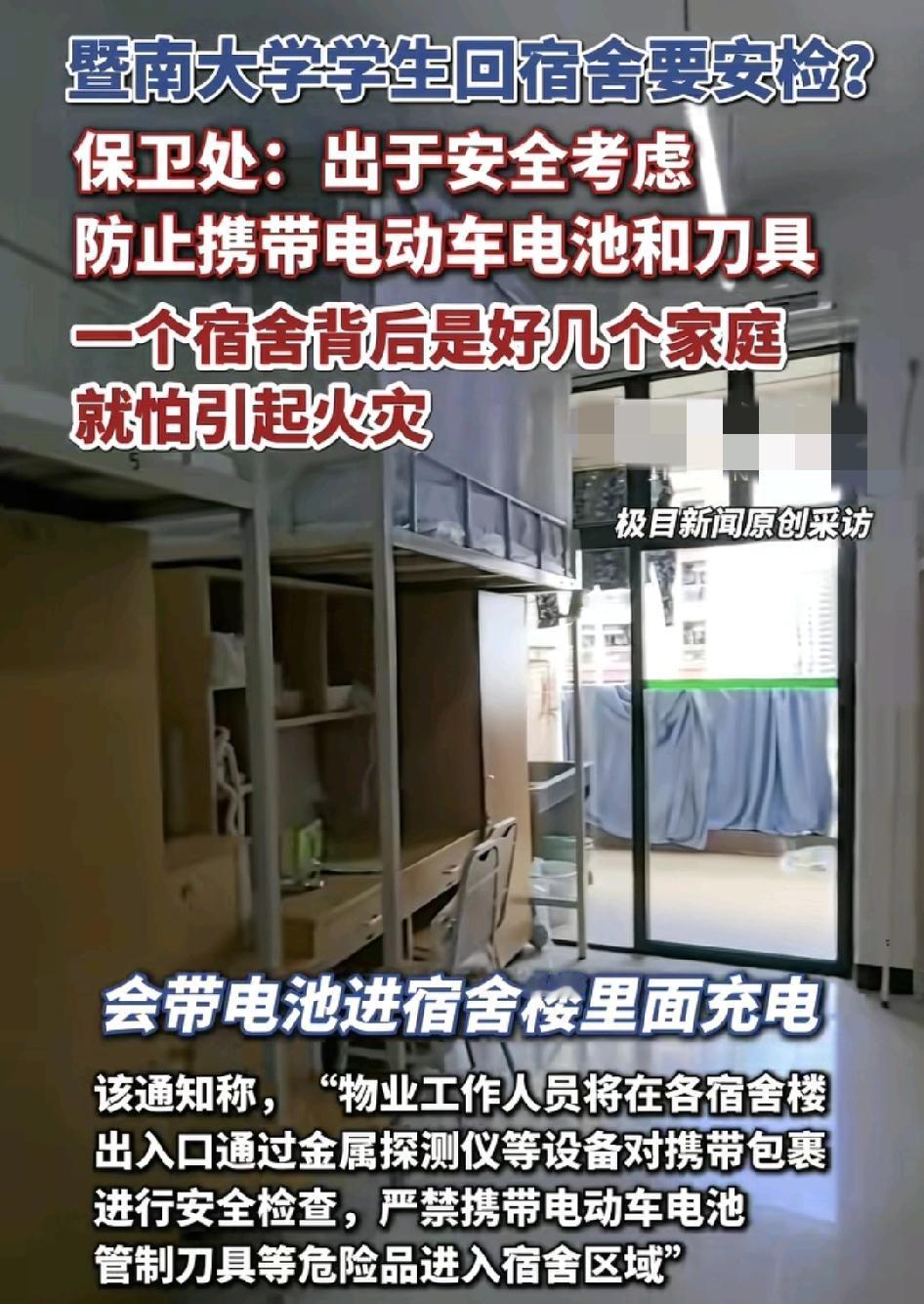 近日,有网友称暨南大学学生回宿舍需要安检,每个宿舍楼层都有金色探测仪,对于带包裹的同学进行检测。为的是防止学生带电动车电池或者是管制刀具进入宿舍。这一切都是为了保证学生的安全,学校表示一个宿舍背后就是几个家庭,怕引起火灾和其他的安全问题。很多网友表示非常支持学校的这个举措,因为不管学校怎么三令五申,总有的同学是不自觉的,这样通过安检,就给学生们加了一道更加放心的防线。