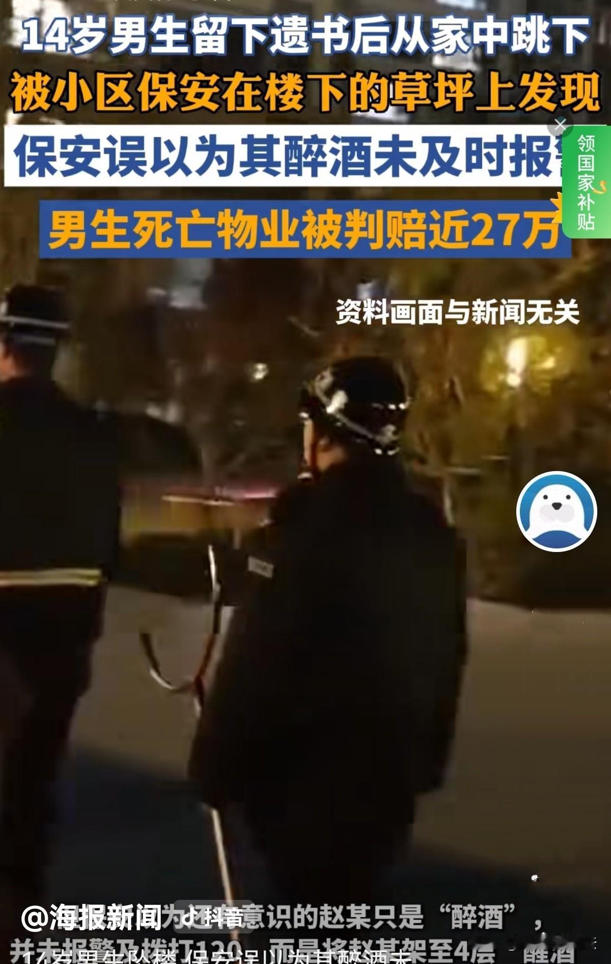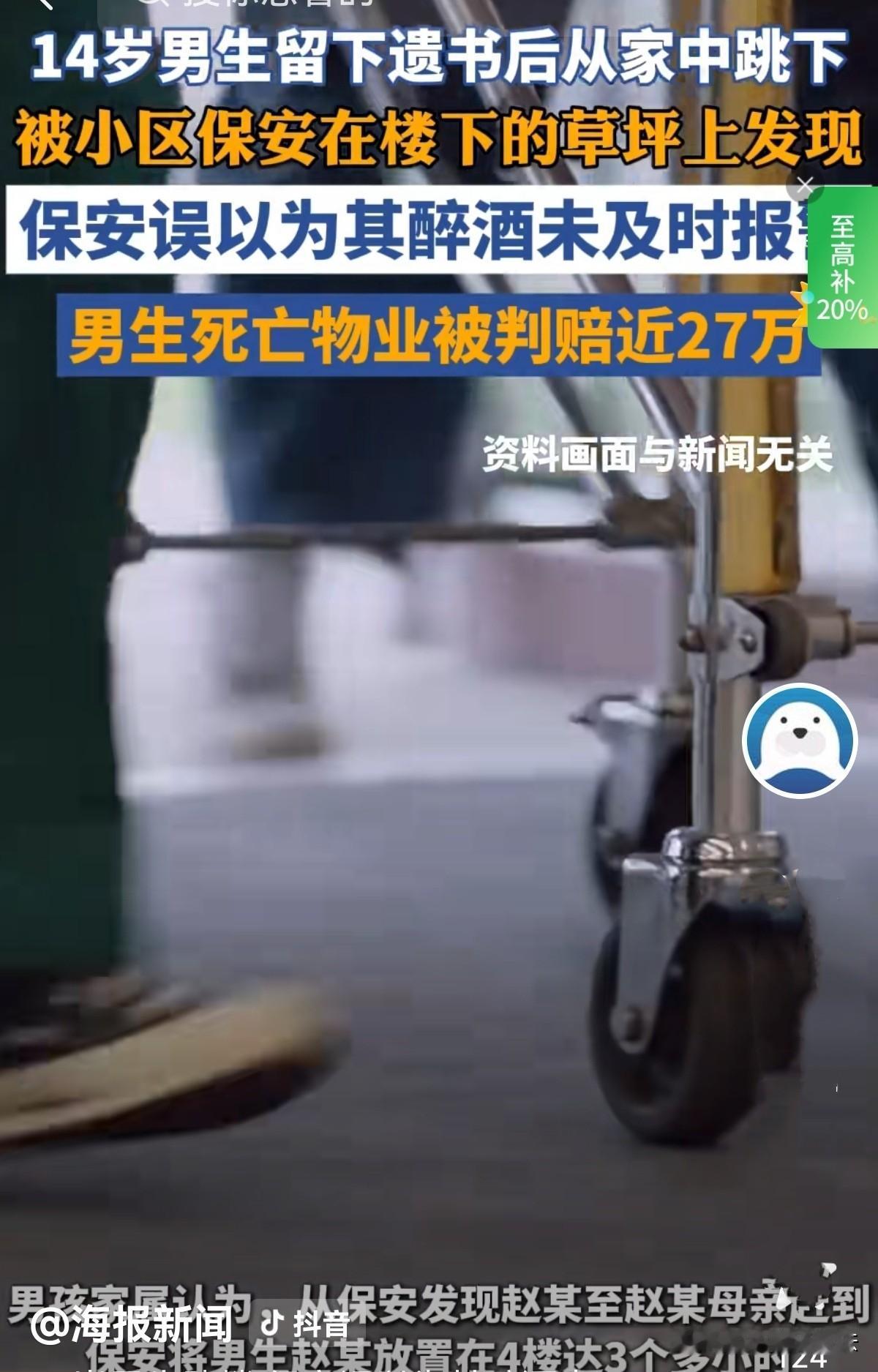 河南许昌,一日下午,14岁男孩留下遗书便从自家10楼纵然跳下。6点左右,两名保安巡逻发现他躺在草坪上,看他意识模糊,误以为喝醉了,便询问他住哪里,需要帮忙打110、120?男孩示意不用,并含糊不清地说家住1001,可保安却听成401。便将他送至401门口“醒酒”。然而男孩家长4个小时后才找到男孩,可一切都晚了,男孩抢救无效身亡。家长悲痛欲绝,将物业告上法庭,认为两保安未打120,还将儿子送到401,耽误他们找孩子,错过了最佳抢救时间,儿子的死亡他们应承担责任。法院这样判的! 2024年11月17日6时许,夜色朦胧,小区里的路灯刚亮起,保安孙某和李某正在巡逻,突然他们瞥见草丛里蜷着个身影,走近一看,似十几岁的男孩。 两人心里咯噔一下,赶紧打开手电筒照过去,男孩眼睛半睁着,脸色惨白,浑身没力气地瘫在草坪上。 孙某看他还有点意识,便蹲下来询问:孩子你怎么了?你住哪栋楼? 男孩声音含糊,勉强挤出“5号楼2单元”。再问楼层,那声音轻得像蚊子哼,孙某听了半天,凑到跟前才听清似的,笃定地跟李某说:他说是401,肯定是喝多了! 他又问男孩要不要打110或者120,男孩的头晃了两下,示意不用,嘴唇动了动没说出话。 孙某心里直犯嘀咕,这么小年纪咋喝成这样?两人一商量,觉得应赶紧送他回家醒酒。于是,他们一左一右架着男孩往4楼走。 男孩浑身软得像没有骨头,全靠两人拖着,他们只当是醉酒后的正常状态,压根没多想,送到401门口等醒酒,扭头就回岗亭。 他们没敲门确认并把孩子交给家长,便匆匆离开,却不知他们的疏忽大意,却放掉了男孩最后的生机。 男孩叫赵某,那年才14岁,当天下午,不知经历了什么的他写下遗书,竟从自家10楼纵身跳下。 幸运的是他坠楼后摔在绿化带的草坪上,虽浑身剧痛,瘫软无力,但他还有意识。 保安询问,他拼尽全力说出自家住1001,可保安竟听岔成了401。 这边赵某的妈妈发现儿子遗书,疯了一样在小区里找儿子,直到晚上9点半,才在4楼的楼道里看到躺在地上的儿子。 那一刻,她的天彻底崩塌,手脚发软地扑过去,抱着儿子冰冷的身体嚎啕大哭,颤抖着手拨打了120。 救护车在9点50分赶到,可一切都太晚了,被紧急送医急救的赵某于10点54分,被医院宣布抢救无效死亡。 抱着儿子的遗体,赵某的父母哭得撕心裂肺,他们恨儿子的轻生,更恨保安的疏忽。 从傍晚6点被发现,到晚上9点半被他们找到,近4个小时,孩子孤零零地躺在楼道里,承受着痛苦,错失了最佳的抢救时间。 他们明明看到孩子站都站不稳,为什么不报警?为什么不叫救护车?即便他们听岔房号,那到房门口也要敲下门,把孩子交给家人吧?也不能扔在门口啊! 哪怕联系一下物业找家属也好啊!那时儿子还有意识,或许还有生还机会!儿子赵某的父亲红着眼眶嘶吼。 赵某父母认为是物业公司和保安的失职,导致了孩子没能救活的重要原因,他们必须为这份疏忽承担责任。 而两保安表示委屈,他们说曾问赵某是否打110或120,是他不让才将他送到401,当时只觉得他是喝醉了,并不知是跳楼啊! 《民法典》第1198条第1款:……公共场所的经营者、管理者或者群众性活动的组织者,未尽到安全保障义务,造成他人损害的,应当承担侵权责任。 物业公司作为管理者,其安全保障义务不仅包括维护公共秩序、防范设施风险,还包括对区域内发现的受伤人员采取合理救助措施的义务。 保安作为物业公司的工作人员,在草坪上发现身体无法自立的赵某后,仅主观判断其“醉酒”,未核实真实情况,既未拨打110、120,也未联系家属,反而将其随意放置在4楼后离开,导致赵某错失3个多小时的黄金抢救时间。 物业方未尽协助救助职责而贻误抢救机会,存在过错,应当承担相应的过错责任。 《民法典》第1173条规定: 被侵权人对同一损害的发生或者扩大有过错的,可以减轻侵权人的责任。 赵某自行坠楼的轻生行为,是损害结果的主要诱因,应承担主要责任。 《民法典》第35条规定:父母对未成年子女负有法定监护义务,包括关注心理健康、防范危险行为。 作为14岁限制民事行为能力人,他留下遗书后坠楼,家长作为法定监护人,未及时察觉其心理异常,且家长拒绝解剖导致无法明确死亡主因。 法院审理认为,家属未尽到充分监护责任,家属需承担主要责任。 最后法院判决:酌定物业承担30%的损失。 物业公司不服,提起了上诉。 可二审法院审理后,维持了合理的判决,最终判令物业公司赔偿赵某家属各项损失254027.4元,再加上15000元的精神抚慰金,总共近27万元。 有人认为,保安责任占70% ,孩子当时没死,你要直接报警或打120,要不然你直接送到家,这小孩不会死!干脆一点 ,你别管他,会给别人救他的机会! 您觉得物业应承担多大责任?