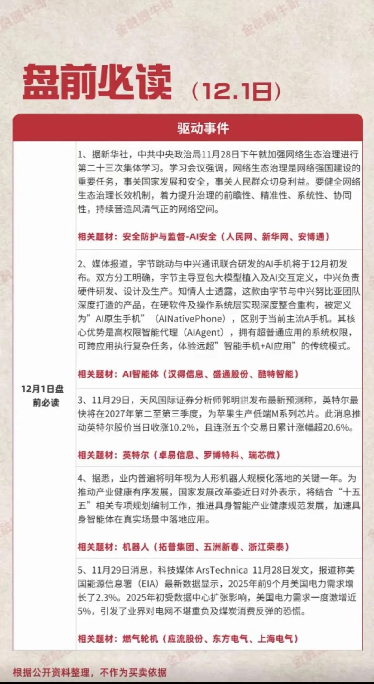 今天A股盘前必读消息汇总!!! 本周末,各种消息发酵叠加近期相关会议召开,AI算力+AI应用智能体+商业航天+机器人+消费(海南/食品/电影等)+医药(流感)热度较高,本周看好相关板块进一步反弹。