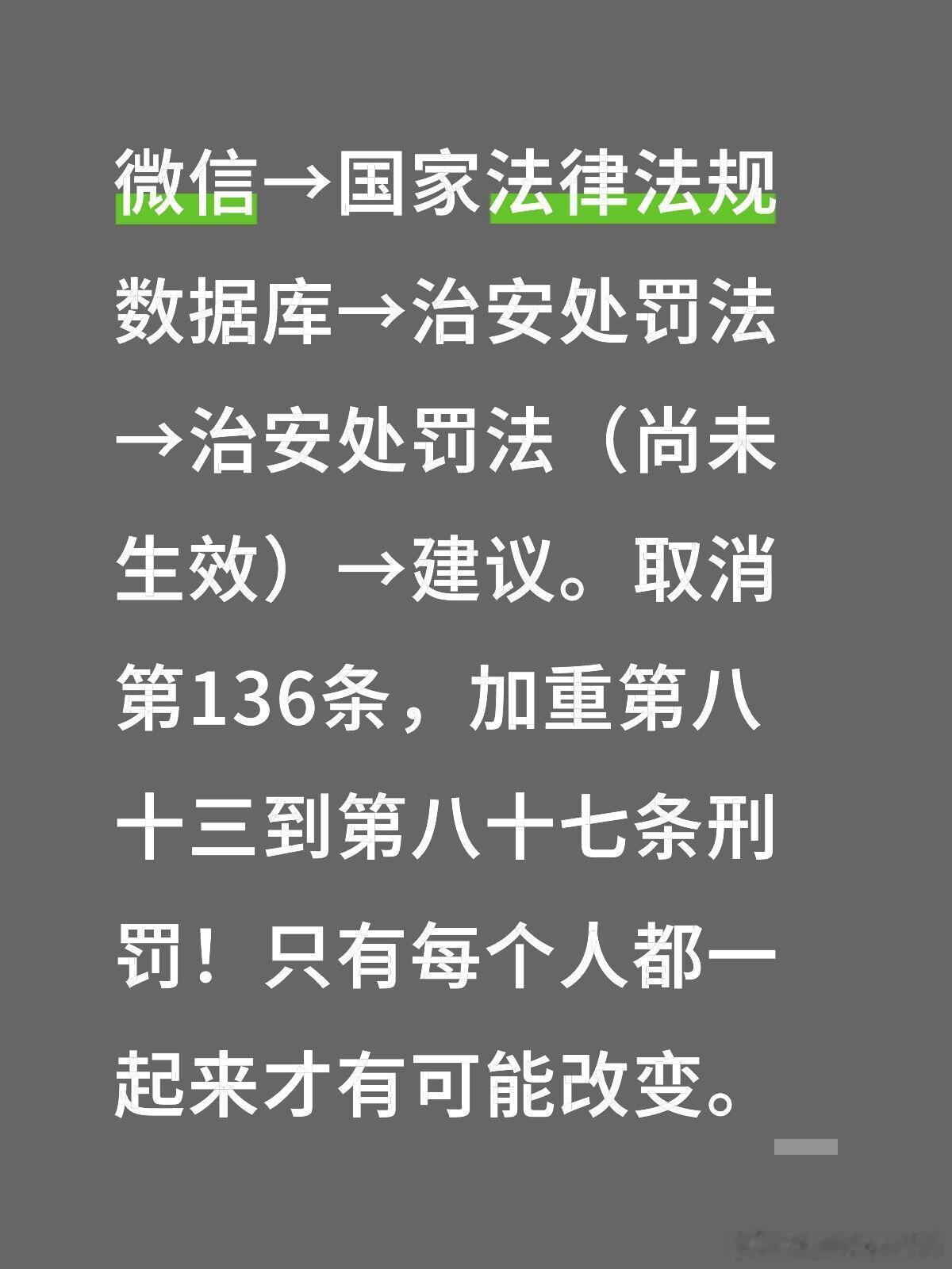 微信→国家法律法规数据库→治安处罚法→治安处罚法(尚未生效)→建议。取消第136条,加重第八十三到第八十七条刑罚!只有每个人都一起来才有可能改变。