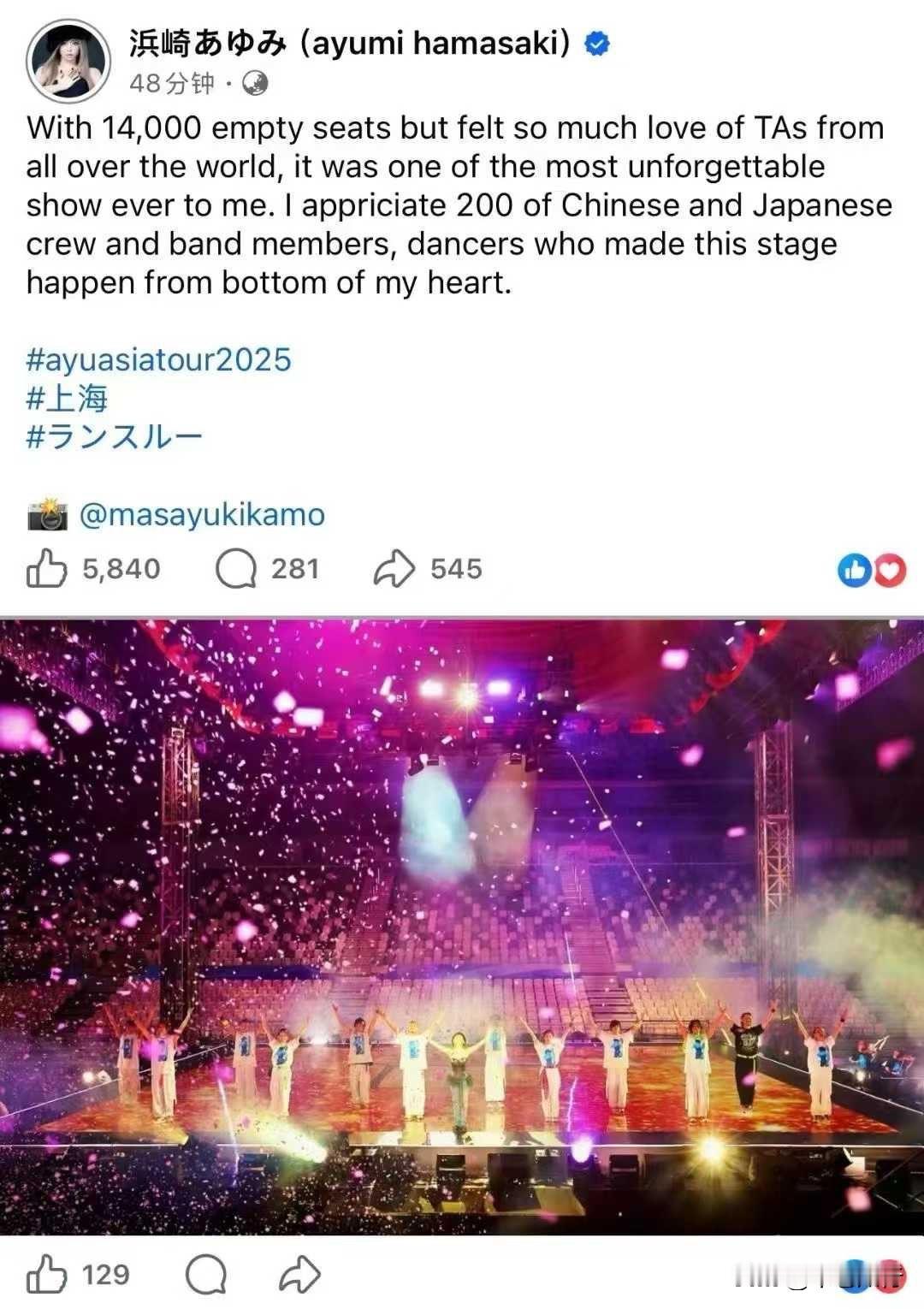 【对着14000个空座鞠躬,滨崎步这职业素养我是服气的】 我看了一圈,网上都在各种猜测,其实这就纯粹是关于“职业尊严”的一堂课。 面对空荡荡的场馆,还要把情绪拉满演完全场,这心理素质真不是一般流量明星能比的。换做别人可能早就心态崩了,她不仅唱完了,还说“感受到了爱”,这就很有意思了。 这种“虽然没人看,但我不能不演”的劲头,在这个浮躁的圈子里,确实挺稀缺。不管外界环境怎么变,守住自己的一亩三分地,把活儿干漂亮,这就是体面。