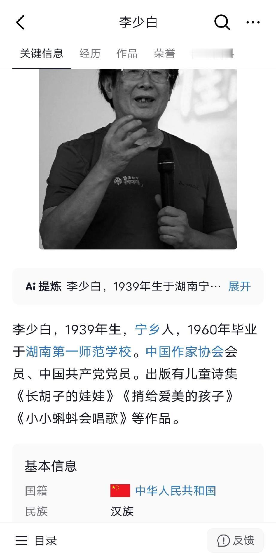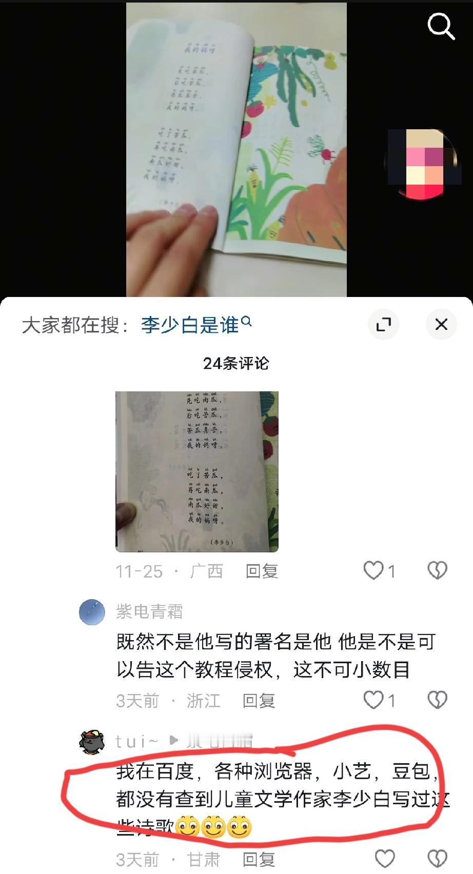 网友发视频吐槽:就这水平的“名家”也能上少儿读本吗?关系户吗? 网友视频里面的这位名家叫“李少白”,去搜了一下,他是中国作协会员,确实出版过几本儿童诗集。 而好事的网友去搜过他的作品,没有网上曝出的《我的妈呀》这几首诗! 目前,李少白本人没有就这个事情出来做出过回应! 如果这几首诗确实系这位李少白所作,那他的水平完全可以跟写出《尿》的贾浅浅相媲美了。如果这样水平的作家都能进中国作协,我也可以进!!!