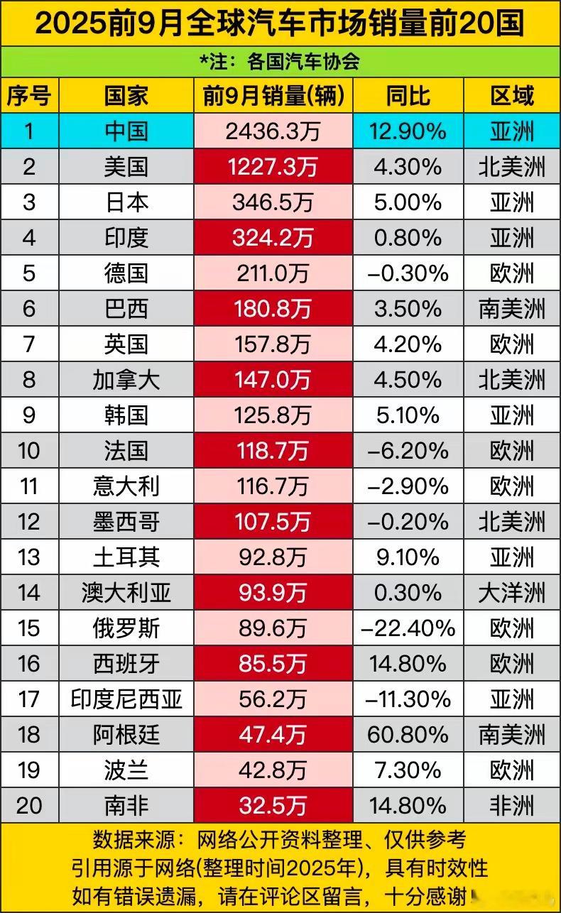 为祖国点赞👍汽车销量就是“经济活力的温度计”。2025年前9个月,中国以2436.3万辆销量遥遥领先,汽车销量比美国、日本、德国加起来还多。这年头,拼的不只是“GDP”,更是“汽车产业竞争力”以前我们总说美国是车轮上的国家,欧洲日本也是,现在轮到中国,中国一年汽车销量竟然比美日德三国加起来还多,说明中国在进步,人民生活水平不断提高,祝贺祝福伟大祖国繁荣昌盛薪火相传!