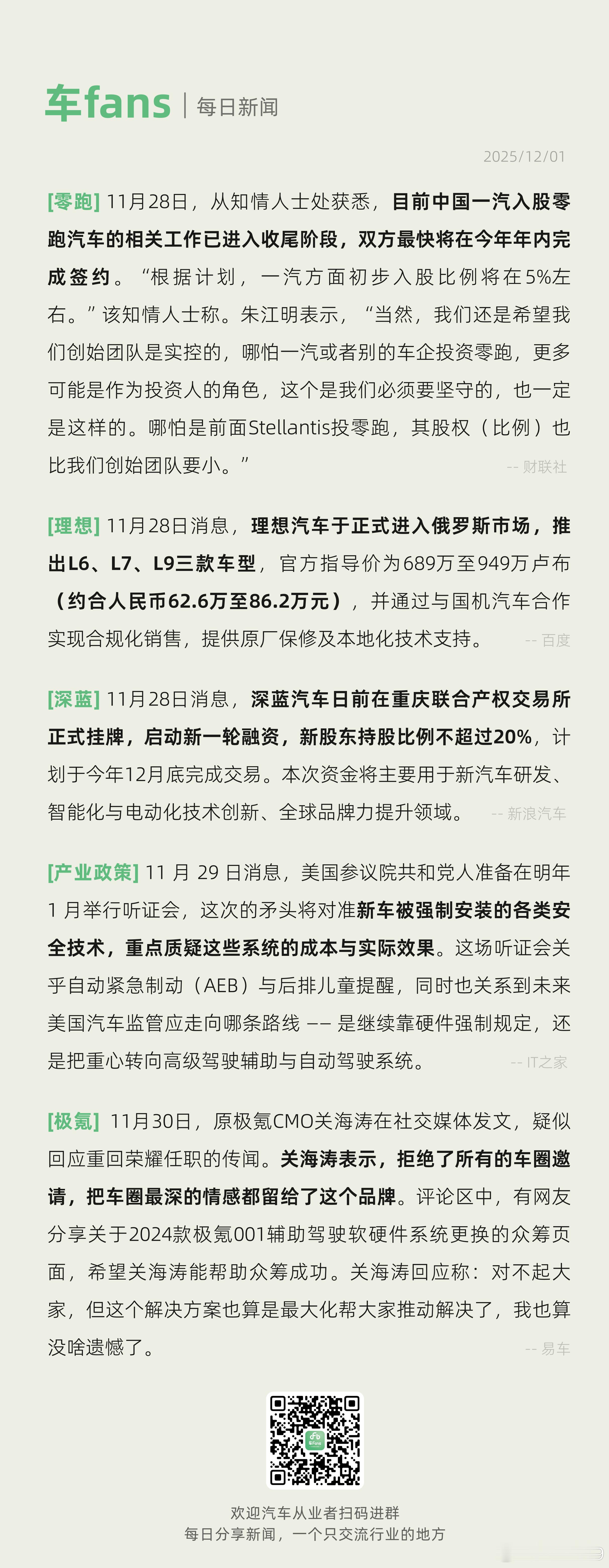 一汽入股零跑已进入收尾、美听证会对准新车强制安装各类安全技术美国参议院共和党人准