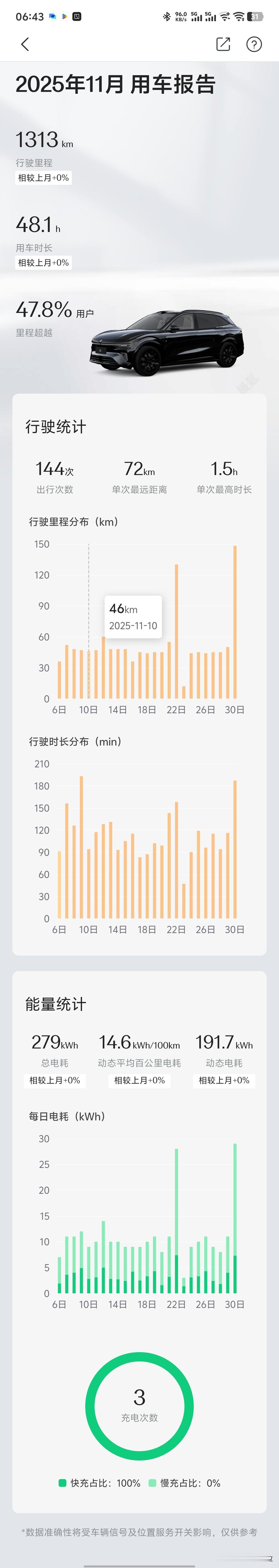 焕新极氪7X第一个月用车报告,1313km居然只能超过47.8%的用户,看来大家开的都比较多。