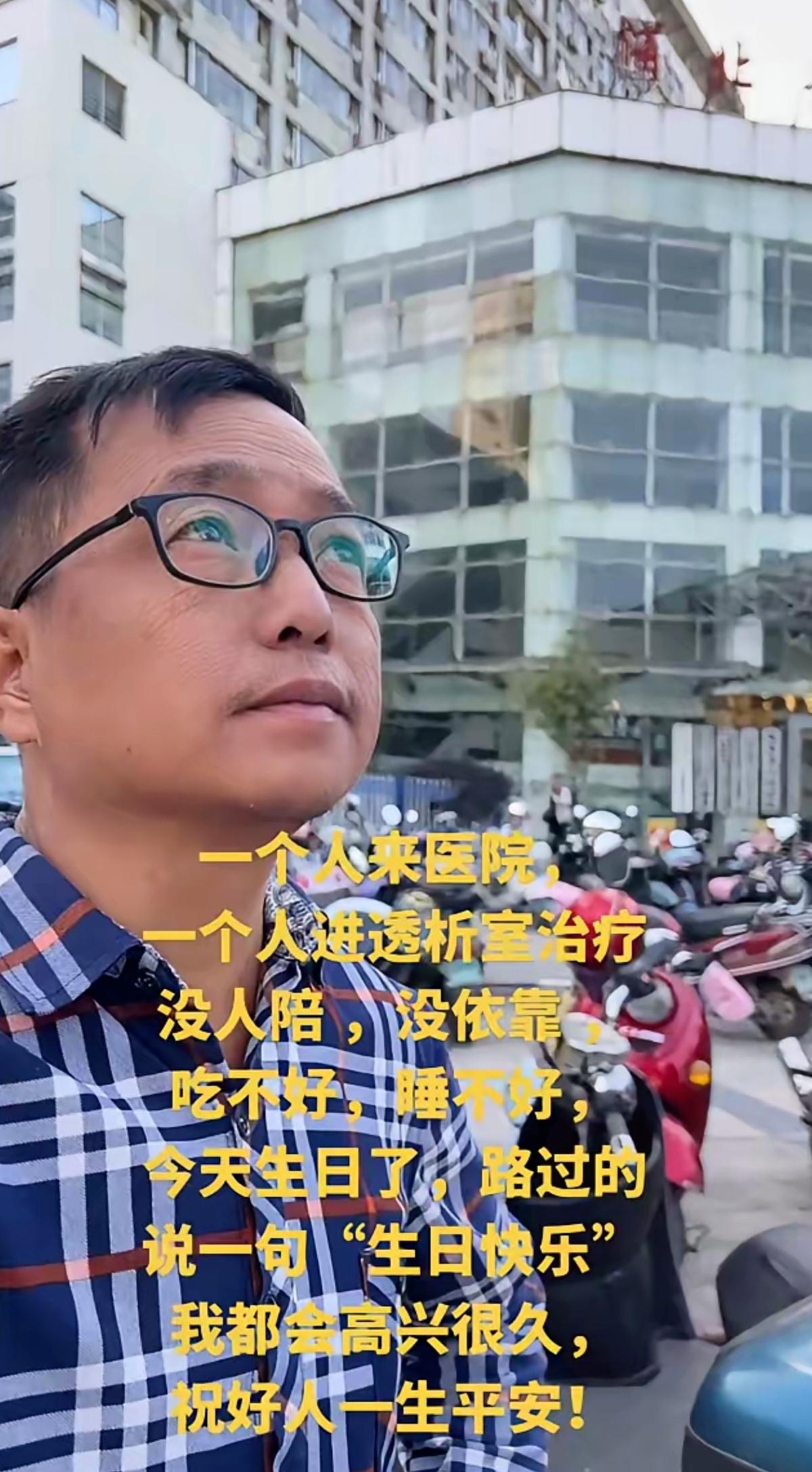一个人闯医院,一个人躺进透析室,没人陪在身边,连吃睡都凑活,这份孤单只有经历过的人才懂。偏偏今天是生日,没有蛋糕没有祝福,可哪怕路过的人随口说句生日快乐,心里都能暖好久好久。 其实人在难的时候,想要的从不是多贵重的礼物,只是一份被记挂的温柔。陌生人的一句问候,就像寒夜里的微光,能悄悄撑着人熬过那些难捱的时刻。这份简单的善意,从来都最有力量,也最让人动容。 愿每个独自扛难的人都能被世界温柔以待,你愿意留下一句祝福,给这个坚强的人吗?一个人 血透晚期的我 孤零零的人