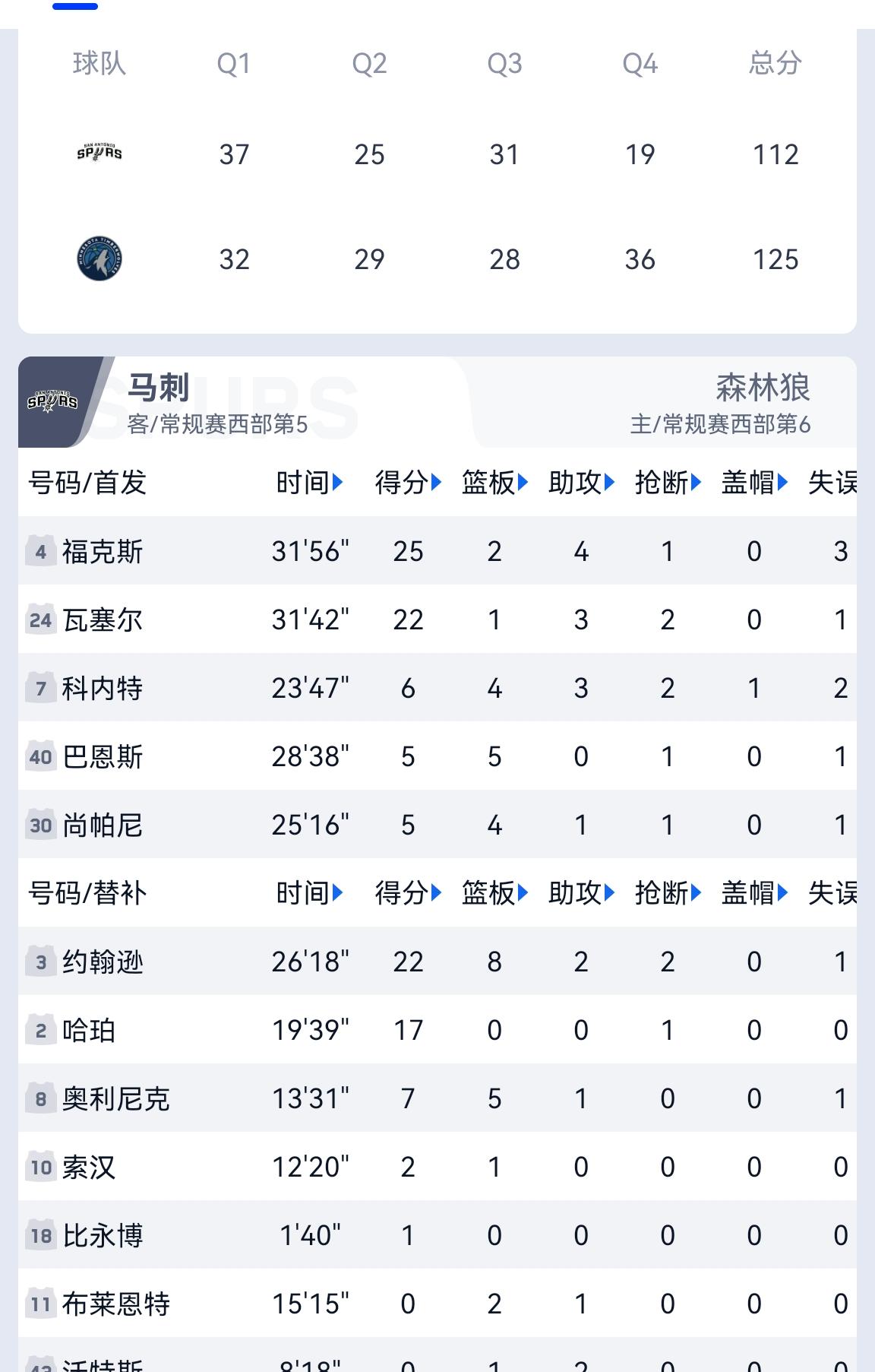 马刺第四节崩盘 输给了森林狼 福克斯完全不会防守 对面三分大空位一堆 瓦塞尔神了两场 回到熟悉了铁匠本色 三分9中1惨不忍睹 还是队魂烤鸡稳定 哈珀未来可期