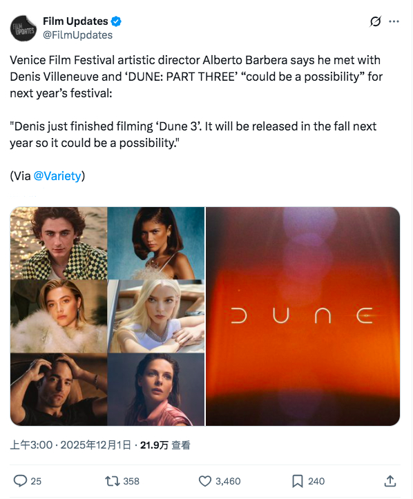 TNABO 威尼斯艺术总监阿尔贝托·巴贝拉透露,他已经在巴结维伦纽瓦,研究让《沙丘III》在电影节首映的可行性