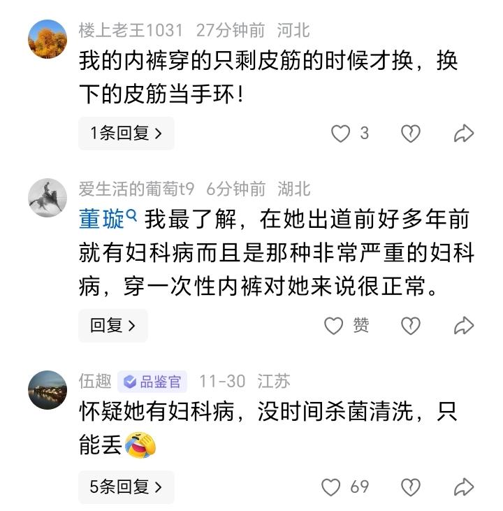 被董璇的话惊呆了! 董璇参加综艺节目时说,她现在内裤都是一次性的,一条100多,穿完就扔了。 说实话,作为明星,经常在外面出差,在剧组拍戏,穿一次性内裤能够理解,因为方便啊。有时候忙起来还要洗内裤确实比较麻烦! 不过,董璇说,她后来已经习惯了一次性内裤了,现在不仅仅出差是这样,在剧组是这样,现在全年都是这样,在家也是这样! 这也太奢侈了吧?我看网上说,明星的一次性内裤都是100多一条,计算下来,一年也是好几万了! 难道说,很多人工作一年,还不够明星一年买内裤的钱吗?太扎心了啊! 楼上老王说,他的内裤穿得只剩皮筋的时候才换,换下的皮筋还当手环!