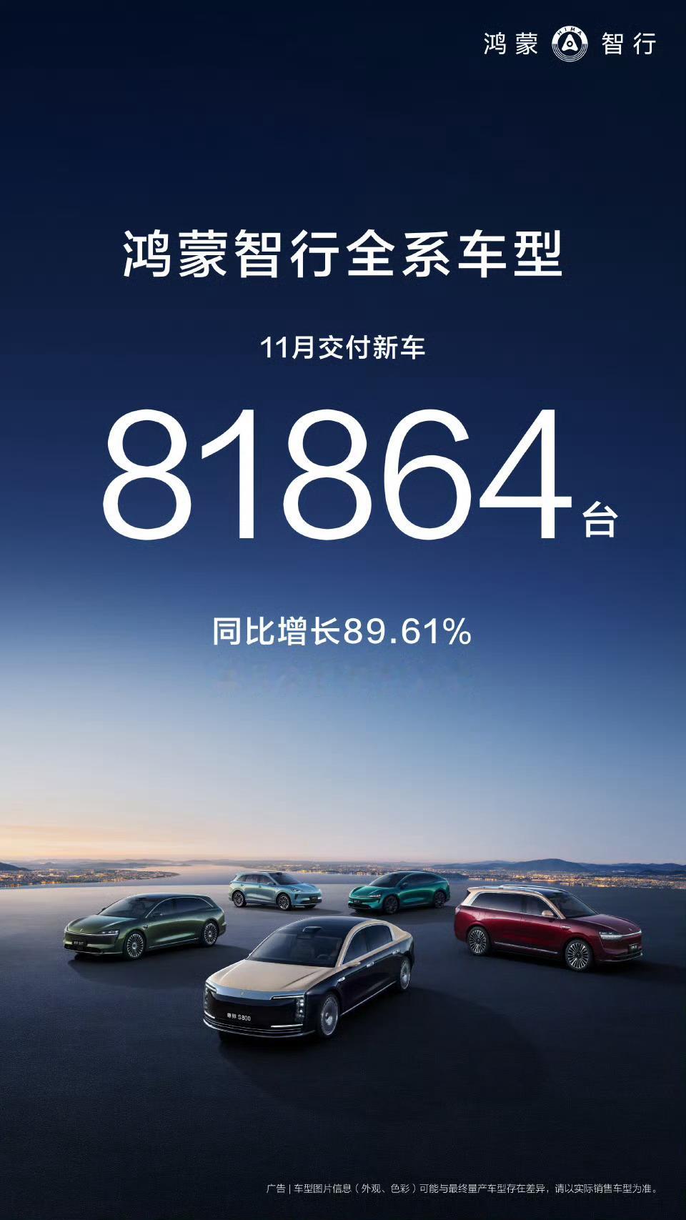 鸿蒙智行11月全系交付新车81864台,同比增长89.61%,一个比一个夸张~