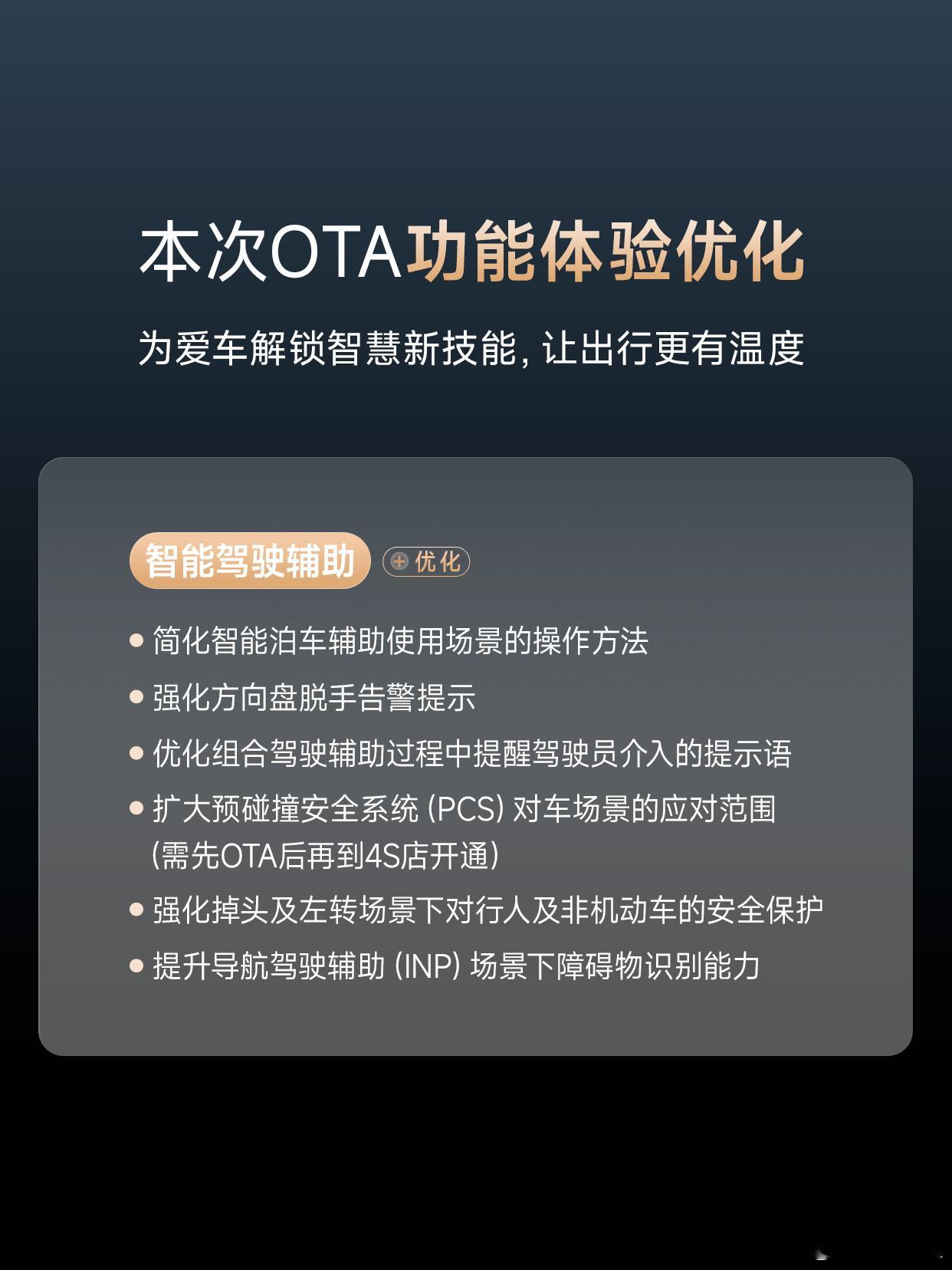 铂智3X年度重磅OTA正式推送广丰这是要把新势力贯彻到底啊,还有年度重磅OTA的大新闻。新势力车我体验很多,如果把新闻里的“丰田”挡住,真猜不出是合资品牌!我最好奇的是新增的这个AI大模型,看描述能力应该不错,不知道实际对话效果怎么样。还有新增这个“场景模式”就是我们很熟悉的任务大师嘛。还可以选择车头车尾泊入泊出。一想到这是一个十万出头的丰田车,带这种程度的智能化水平,除了服气没别的!