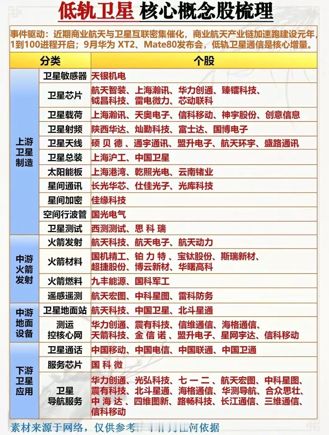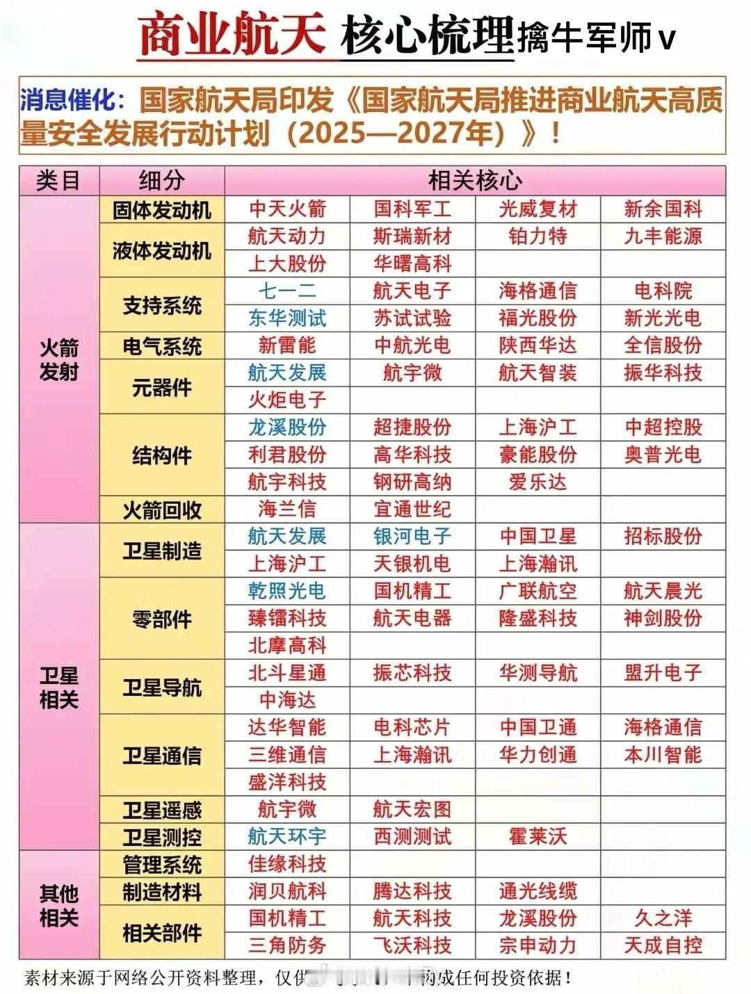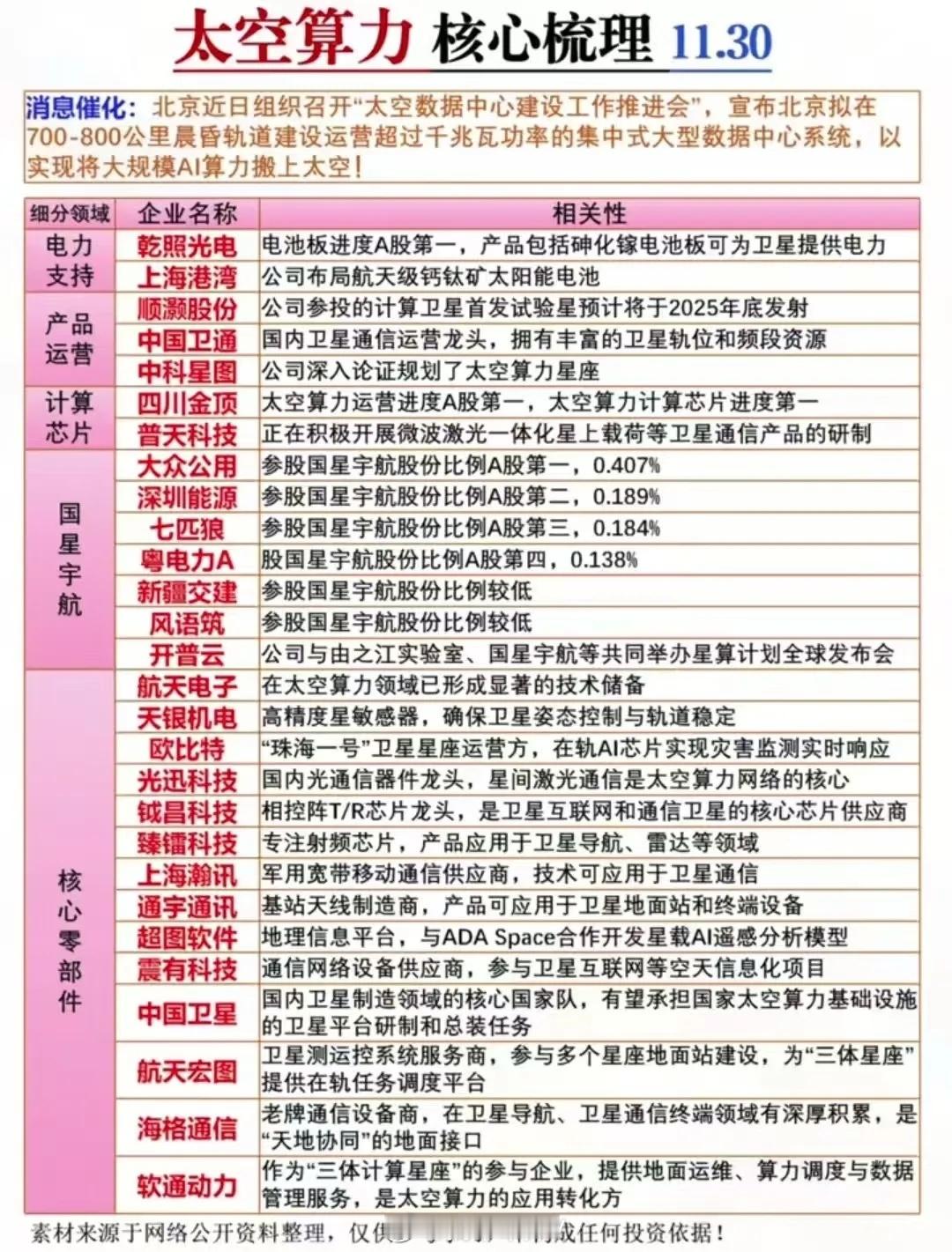 商业航天产业链核心龙头梳理!题材概念驱动事件:11月29日消息,国家航天局已设立商业航天司并开展相关业务,并发布《推进商业航天高质量安全发展行动计划(2025—2027年)》。相关概念人气龙头代表:航天发展、银河电子、航天环宇、雷科防务、通宇通讯。另外,北京又要建太空数据中心,把AI算力搬上700公里轨道,电力、芯片、核心部件的相关玩家也都安排得明明白白。这波航天+科技的联动,是不是有点未来已来那味儿了?太空算力概念龙头代表:乾照光电、中国卫通、普天科技等等。理财有风险入市需谨慎!