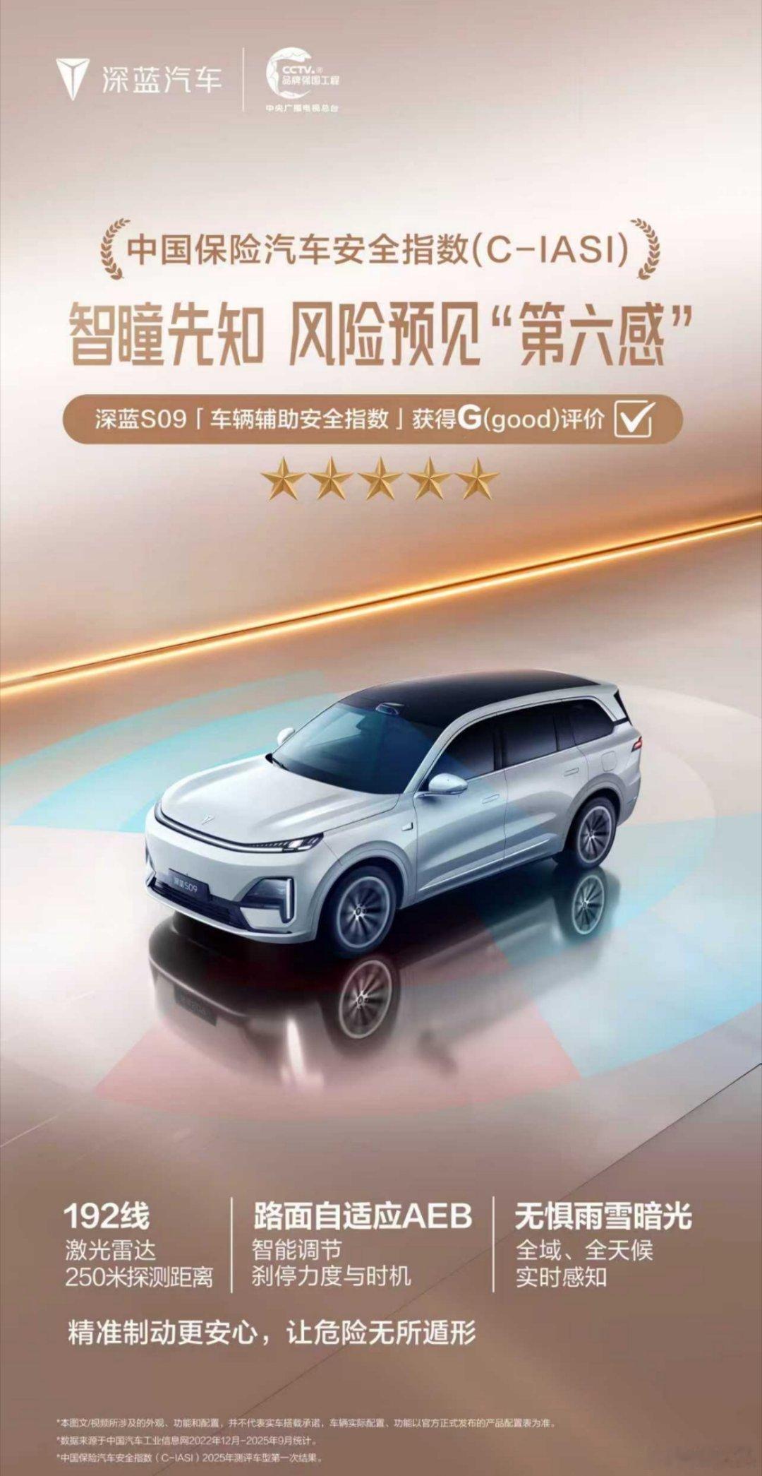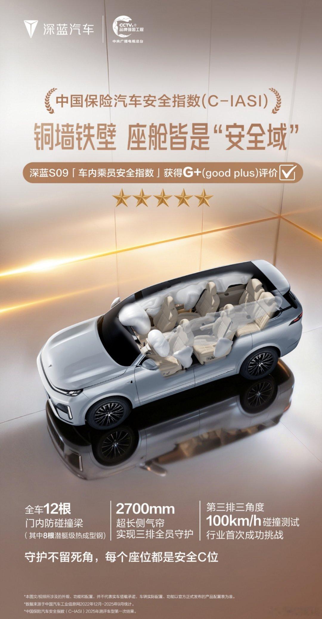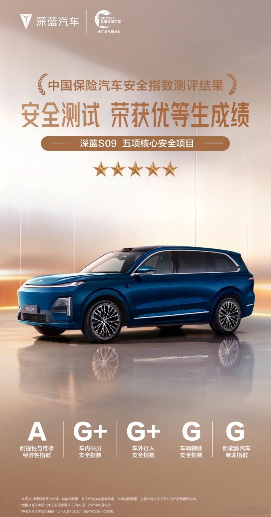 中国保险汽车安全指数(C-IASI)正式发布新一轮评测结果,深蓝S09在“耐撞性与维修经济性”“车内乘员安全”“车外行人安全”“车辆辅助安全”及“新能源汽车专项指数”五大核心维度中,斩获“AG+G+GG”的优异成绩,成为首批获得新能源新G级评分车型。