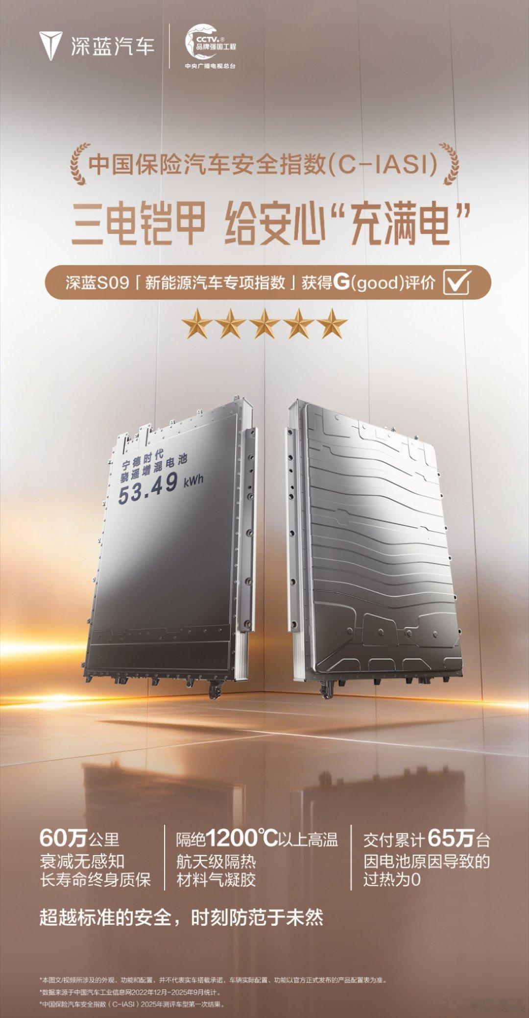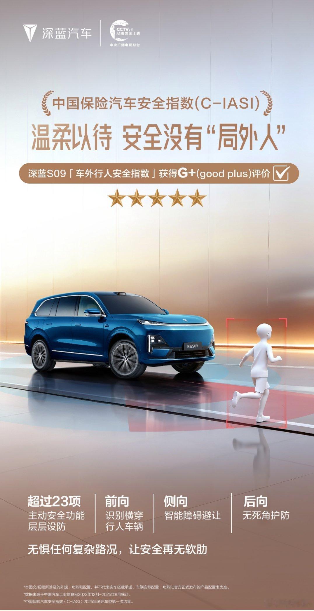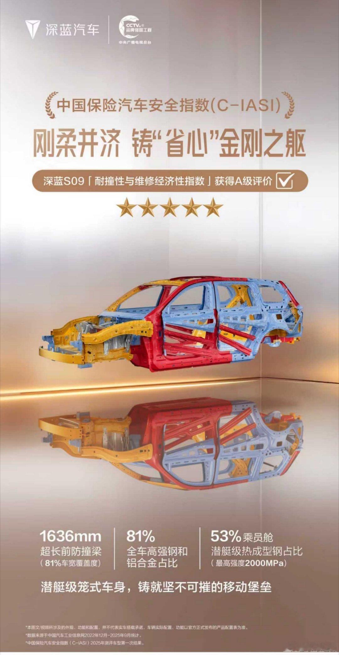 中国保险汽车安全指数(C-IASI)正式发布新一轮评测结果,深蓝S09在“耐撞性与维修经济性”“车内乘员安全”“车外行人安全”“车辆辅助安全”及“新能源汽车专项指数”五大核心维度中,斩获“AG+G+GG”的优异成绩,成为首批获得新能源新G级评分车型。