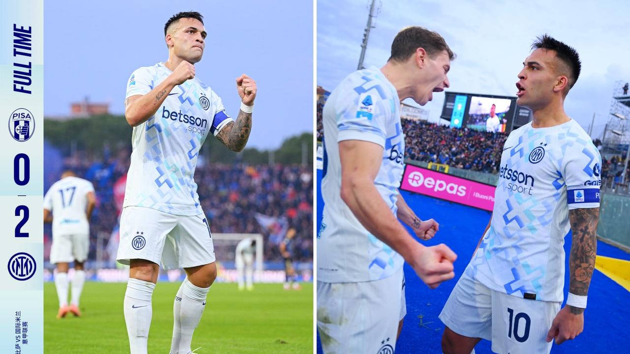意甲:国际米兰客场2-0击败比萨,终结连败落后榜首1分。 劳塔罗完成梅开二度,并