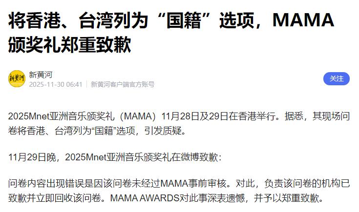 11月29日,亚洲音乐颁奖礼上,主办方将香港跟台湾列为国籍选项,而且这不是第一次! 消息一出来,网友们的火气一下就上来了,这可不是什么小疏忽,是明晃晃地碰我们国家主权的红线。更让人不舒服的是,主办方的道歉声明读下来,满是敷衍的味道,压根没说到点子上。 先说说这个主办方,韩国的CJ ENM,号称“韩国格莱美”的主办方,按理说也是国际上有头有脸的文娱公司,怎么会连“香港是中国的特别行政区,台湾是中国不可分割的一部分”这种基本常识都搞不清楚? 更蹊跷的是,这不是他们第一次犯这种错了。早在2017年,他们官网投票就把港澳台标成了“国家”,当时也是道歉了事,说会整改。结果八年过去了,不仅没改好,反而在香港举办的现场又出了同样的问题,这真能算“审核疏漏”吗? 有人可能会说,会不会是真的不小心?但稍微动脑子想想就知道不可能。这次活动在香港办,前期肯定要跟当地各方沟通协调,连火灾后取消红毯这种细节都考虑到了,怎么偏偏最关键的“国籍”选项没人把关? 更有意思的是他们的道歉声明,只说“内容出现错误”,提都没提香港和台湾是中国的一部分,反而把锅甩给了第三方问卷机构,说自己没提前审核。 这种说辞简直站不住脚,第三方是主办方找的,审核责任本来就该主办方担着,出了问题就推给别人,这是负责任的态度吗? 其实往深了想,主办方的心思不难猜。他们眼里盯着中国庞大的市场,毕竟不管是韩国偶像还是颁奖礼,都靠着中国粉丝的支持赚了不少钱。这次特意跑到香港办活动,说白了就是想拉近和中国市场的距离,多赚点人气和收益。 但他们又不想真正尊重中国的核心利益,觉得犯了错道个歉就行,反正之前也这么蒙混过关了。这种“既要又要”的心态,才是最让人反感的——既想捞好处,又不愿守规矩,把道歉当成了进出中国市场的万能钥匙。 可能有人觉得,文娱产业没必要谈这些“严肃话题”,开心就好。但实际上,文化从来都不是脱离政治的空中楼阁,尤其是国际文娱活动,尊重主办国和受众的国家主权,是最基本的底线。 就像中央纪委国家监委网站说的,文艺不能当市场的奴隶,要是为了赚钱连国家主权都不顾,这种活动根本没人稀罕。 CJ ENM作为行业巨头,不可能不懂这个道理,他们一次次犯错,本质上是心存侥幸,觉得中国观众“记吃不记打”,道歉之后照样会买账。 我们从来不反对国际文娱交流,相反,大家很欢迎真正尊重中国的外国文化项目来交流。但尊重从来都是相互的,你想在中国市场分一杯羹,就得先守住我们的底线。 这次MAMA的事件也给所有国际文娱公司提了个醒:道歉只是认错的开始,不是免责的金牌。如果只是嘴上说“抱歉”,行动上却屡教不改,甚至故意模糊主权问题,那不管你的颁奖礼多有名,明星多耀眼,中国市场也不会给你留位置。 毕竟,主权问题没有商量的余地,这一点,谁都不能忘。