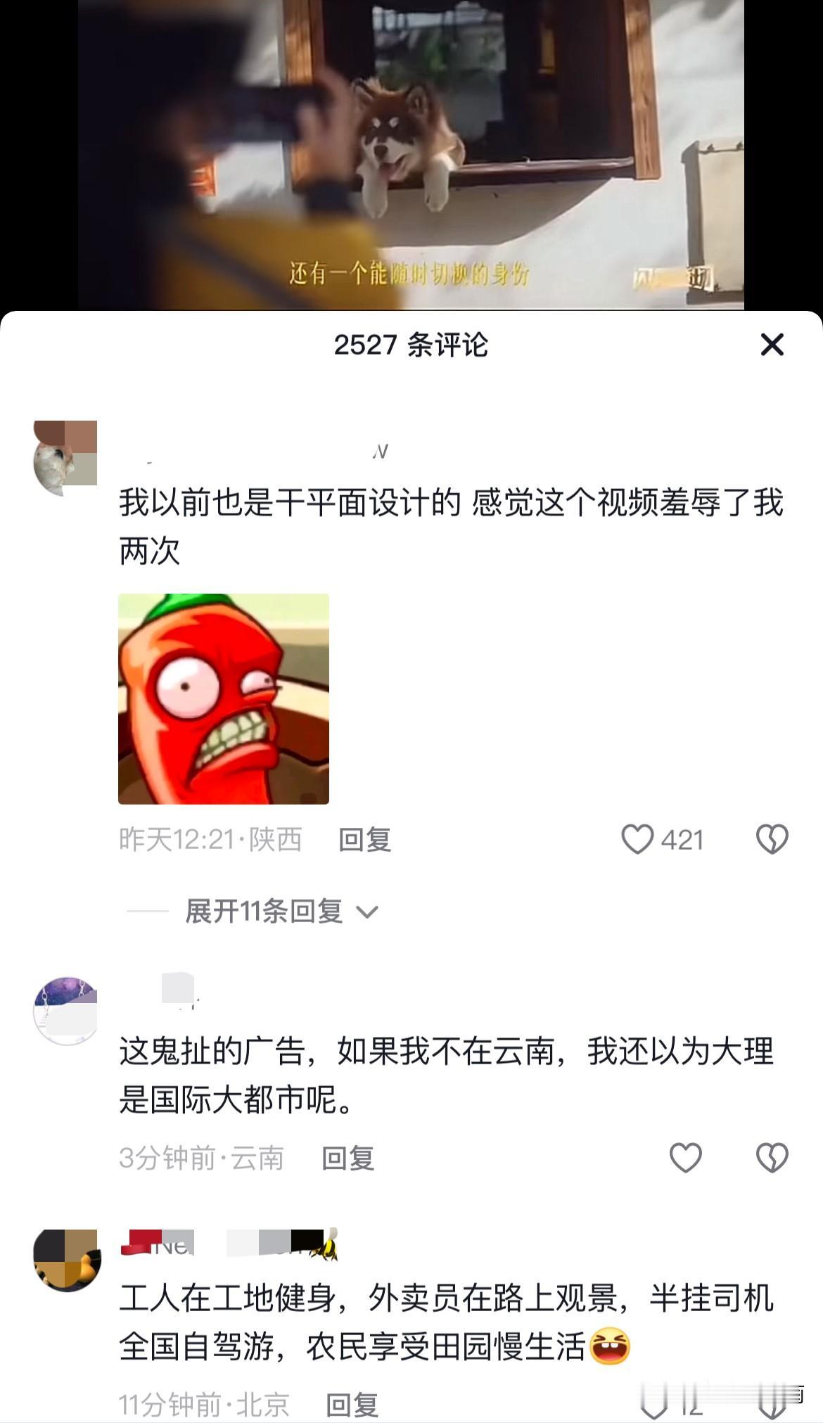 万万没想到,央 视也有翻车的时候。 化着淡妆的妆她,原来是一名平面设计师。厌倦了两点一线的枯燥生活。选择去大理送外卖。主要原因就是可以一边送外卖,一边欣赏大理的沿途风景。 就这样送了三个月外卖后,她用送外卖的钱入手了一台价值近1.5万元的照相机。 她喜欢大理的风景,所以不能光欣赏,还要把它们记录下来。 让人意想不到的是,这条由央 视和美团联手打造的旨在反映外卖员努力工作热爱生活的视频,评论区却画风大变,最后不得已把视频下架了。