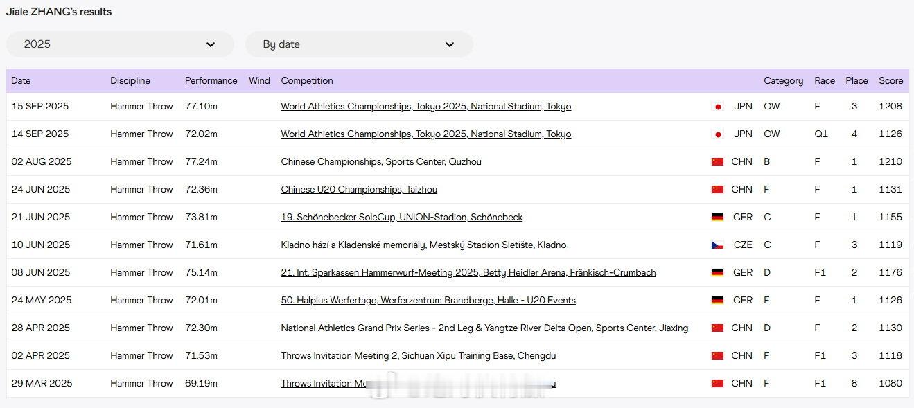 2025世界田联的年度新星是:中国链球选手张家乐和肯尼亚长跑选手 Edmund Serem(主项3000米障碍)附上张家乐今年的表现。中国田径梦之队 链球 田径