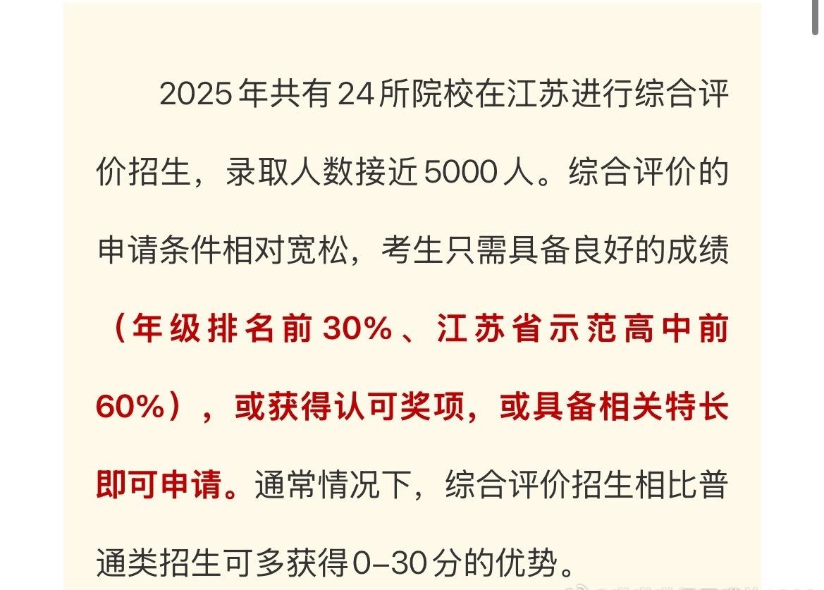 高一(上)期中考试后的家长会2️⃣ 强基🆚综评 强基是只有39所985高校才有资格的; 综评在江苏是有24所高校有资格的(主要都是省内的高校) 但是不管是走强基还是走综评, 最后的高考成绩的占比基本上都是大部分(除了中外合作的) 大部分就是校测占15%,高考占85%。 然后按照他的招生计划进行排序、入围。 以清北的强基为例: 依据高考成绩,按照强基招生计划人数的6倍确定各个省的入围的考核的名单,也就是1:6。 那么如果你在竞赛里面获得了银牌以上,那么你就是可以获得破格入围。 入围是什么意思呢? 入围就是有资格去参加他的校测啦。 你要拿到15%的成绩,你首先要有资格去校测。 ‼️但是政策的变化在哪里? 24年之前,只要你拿到银牌那校测的1️⃣5️⃣分就直接送给你了,那么然后再加上高考的换算分, 但是! 25年这个政策就发生变化了! 你拿到了银牌,还是要参加校测的,你拿到银牌就只是变成了校测“门槛”! 举例:去年我校有同学拿到了化金,一开始非常高兴,他觉得拿了金牌的话这个15%校测满分稳了然后他只要拿他的高考成绩加一加就OK了。 可是25年政策就发生变化了,即使是拿了金牌,也只能是进入他的校册的一个名单,好,然后他还是要去“考”校测分的。 最后这个分数加起来不够,达到清北强基的最低分数线,所以这位同学就非常可惜! 后来他就到了南大去走综评, 为什么呢? 因为强基你是只能报一所学校,虽然有39所985高校招生,但是你也只能报一所。 综上‼️ 高考一定是最最最重要的,而其他的任何的强基综评它都是一种辅助,它是锦锦上添花的。 所以你如果孩子没有这个竞赛这方面的实力也没有关系,老老实把高考抓好,对吧?