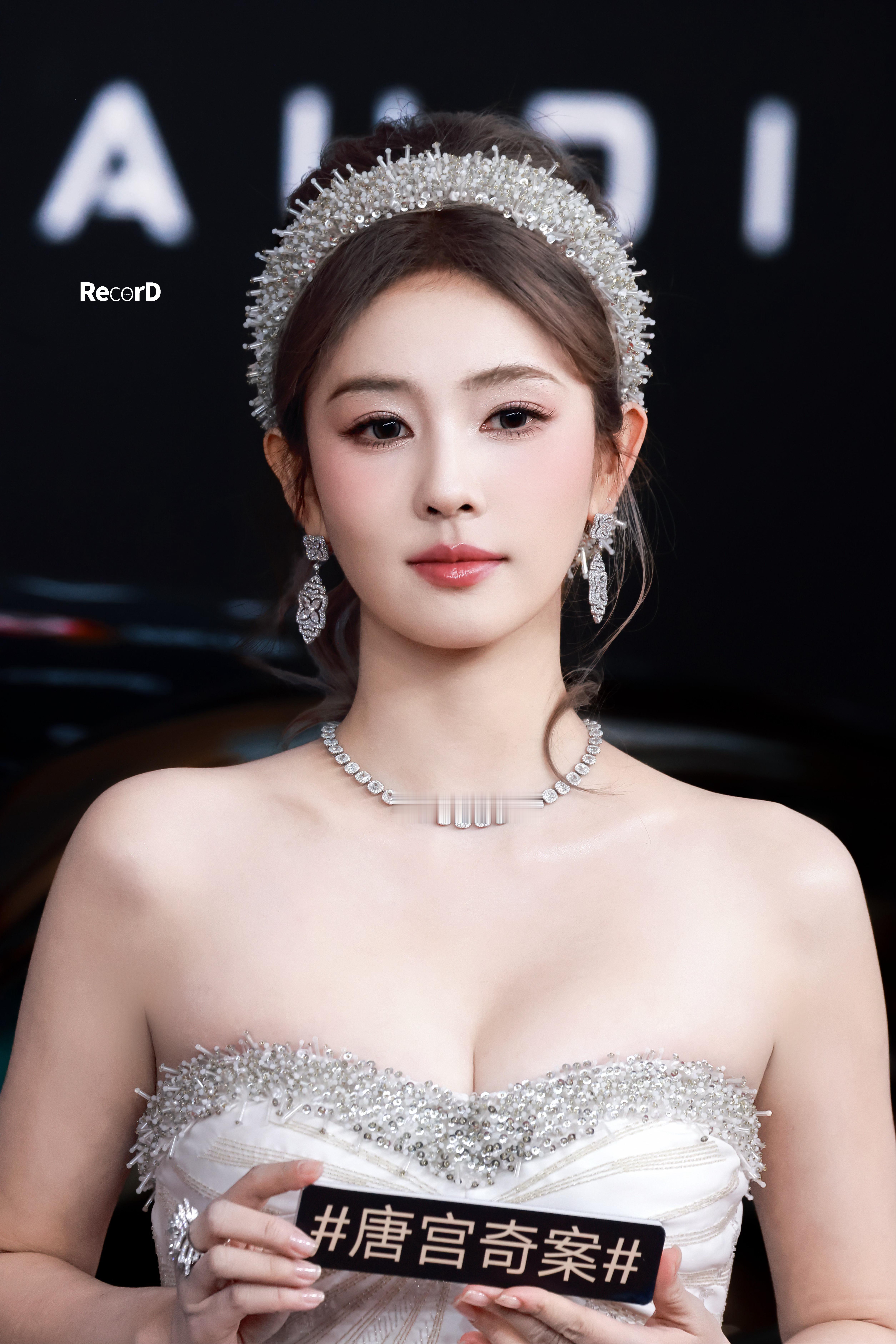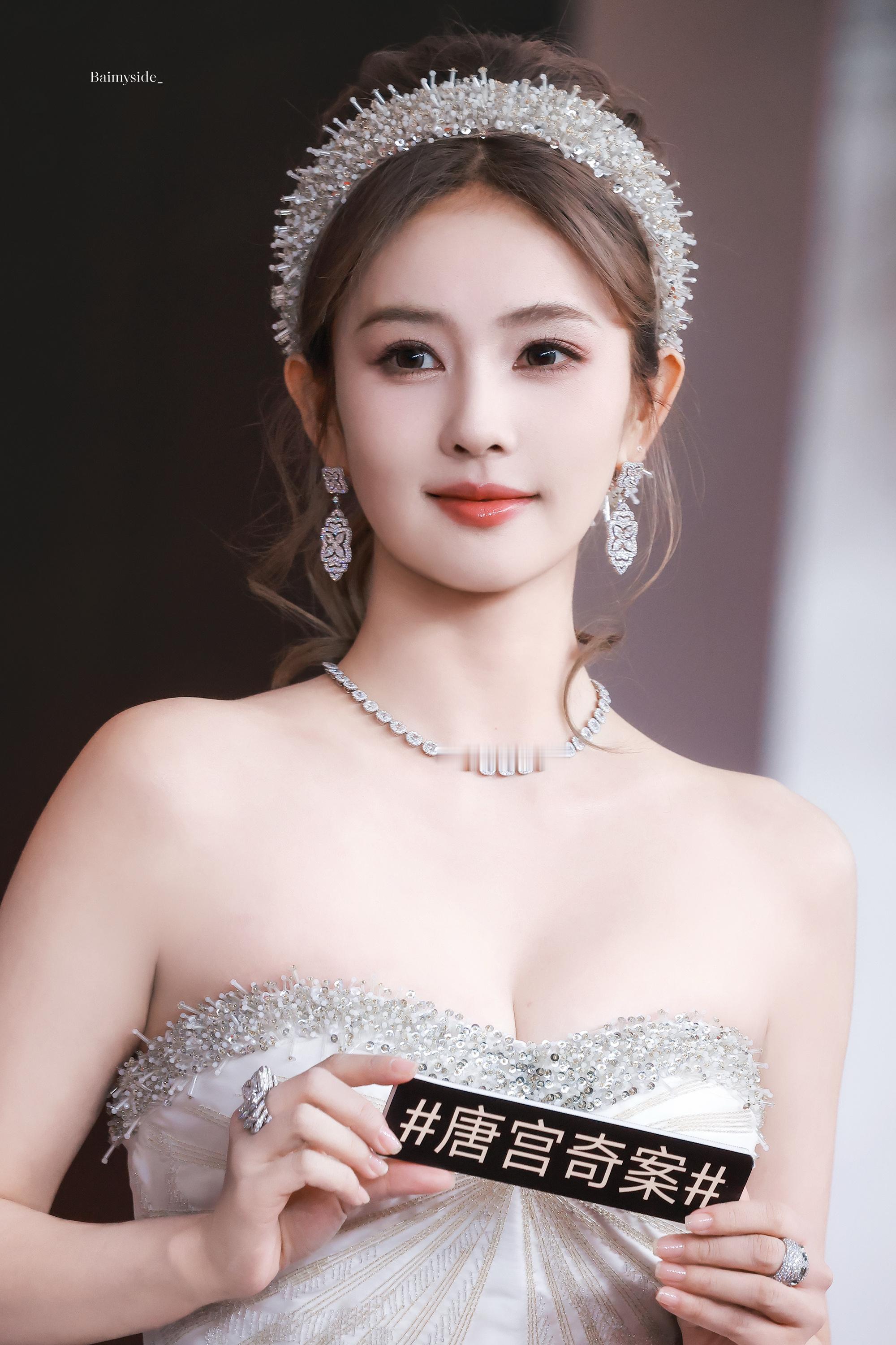 白鹿 一袭钻饰白裙,肩颈线条如月光雕琢,那抹腰肢盈盈一握,恰似唐宫奇案里走出的尤物。
