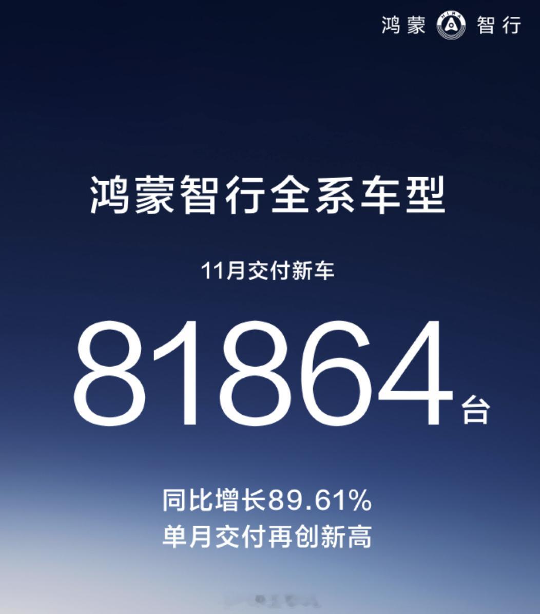 11月,鸿蒙智行全系交付新车81864台。后续看看细分问界、智界、尚界、享界、尊界分别多少台新能源汽车鸿蒙智行大V聊车