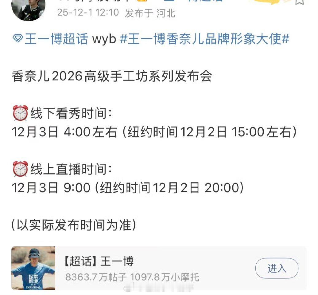 王一博将出席香奈儿2026年高级手工坊大秀!期待了